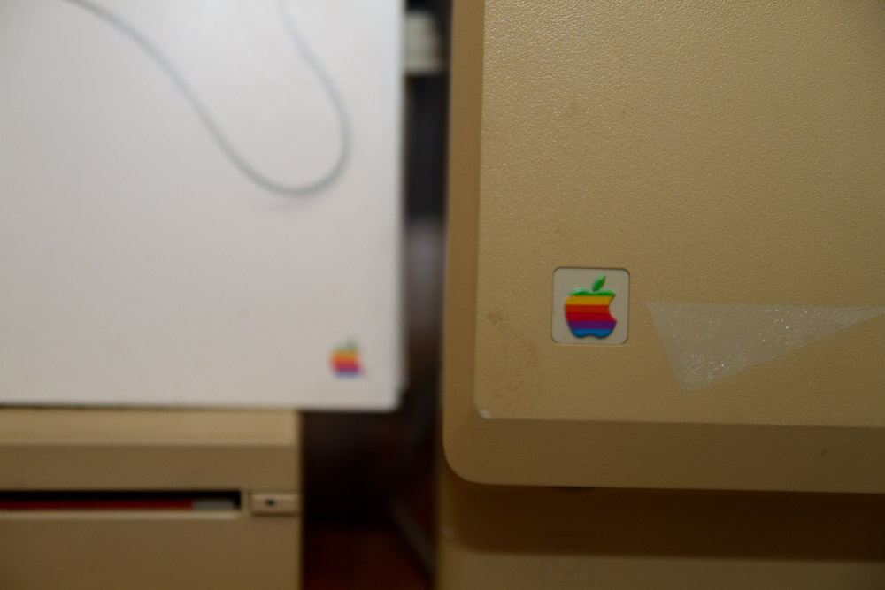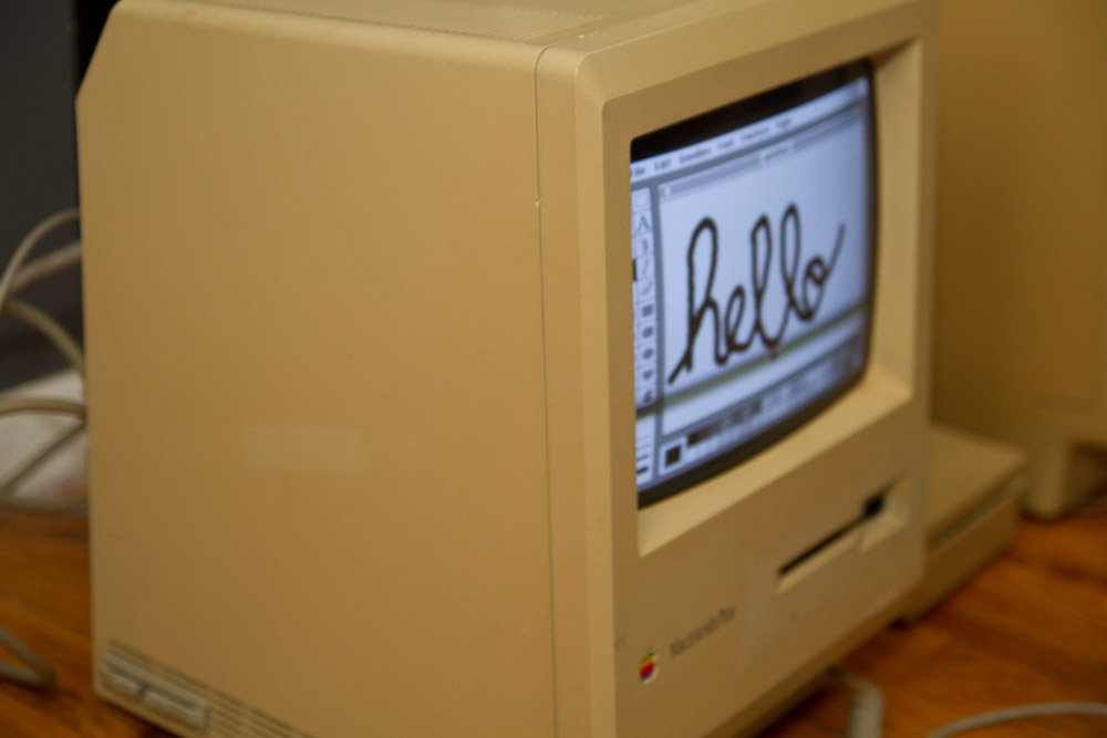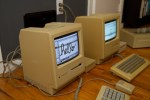 I’ve only had a little bit of time to play with them so far, but both of the machines are really cool. Neither have hard drives – they run solely off of floppy disks (hence the external drives). I expected long boot up times, but they actually boot pretty fast, within 10 seconds or so from the happy Mac symbol to the desktop. The disks don’t hold much of course, but otherwise they work really well. There is a ton of software included that I still need to explore – everything from office applications to clipart to music. The Macs came from Harvard so there is also a bunch of educational stuff on there.