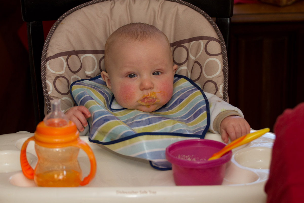 For no reason at all Zach started eating vegetables again. It. Was. Amazing! Whole vegetables? Sure. Pureed vegetables? Why not! Happy as a clam he’d eat them just fine. It was great. The problem was that now Adam hates vegetables. Hates them. Wants nothing to do with them. First it was just green beans. Then green beans and peas, then carrots, then potatoes. He’d pick them up off of his tray and shovel them into his mouth only to realize they were dreaded vegetables and spit them out. We bought some Stage 2 and 1/2 “textures” baby foods to see if they’d eat them. They have a mixture of pureed food with some pieces for texture. One of them was Aquash with Apple chunks. Zach loved it. Adam, nope! How about Squash and Zucchini? Nope, too chunky. Again Zach ate it fine.