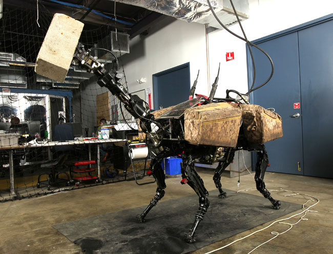 There were 10 or 12 videos of the various robots that they currently have – one that jumps like a flea, one that slaps its way through mud, a couple that walk like humans, and of course, Big Dog, the quadruped robot that made the company famous. Big Dog is a four-legged robot designed to carry things around. It can move over various terrain and even keep its balance when it slips or it is kicked. There is a variation of Big Dog with an arm on its front that can be used to pick up objects and throw them; that’s where the boys had their fun.