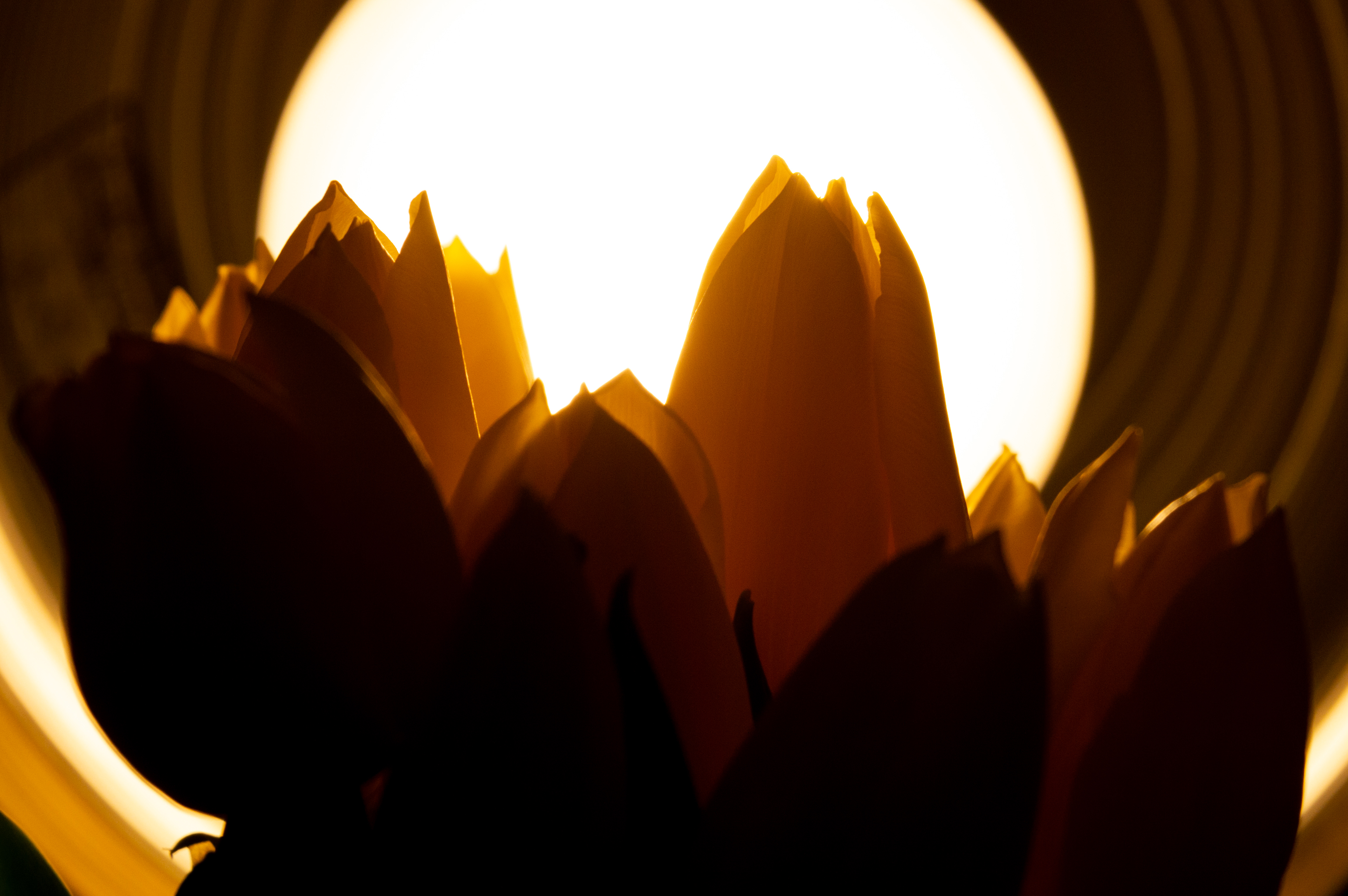 I tried a bunch of “studio” lighting setups in my dining room, using an LED flood light bulb plugged into a work lamp clipped to a chair to get high-key photos with completely white backgrounds. I placed the light behind the tulip and put my camera on a tripod so that it could properly expose the shaded side that was only lit by the dining room lights. These 1/4 and 1/25 second exposures blow out the bright background until it is white, no backdrop required.