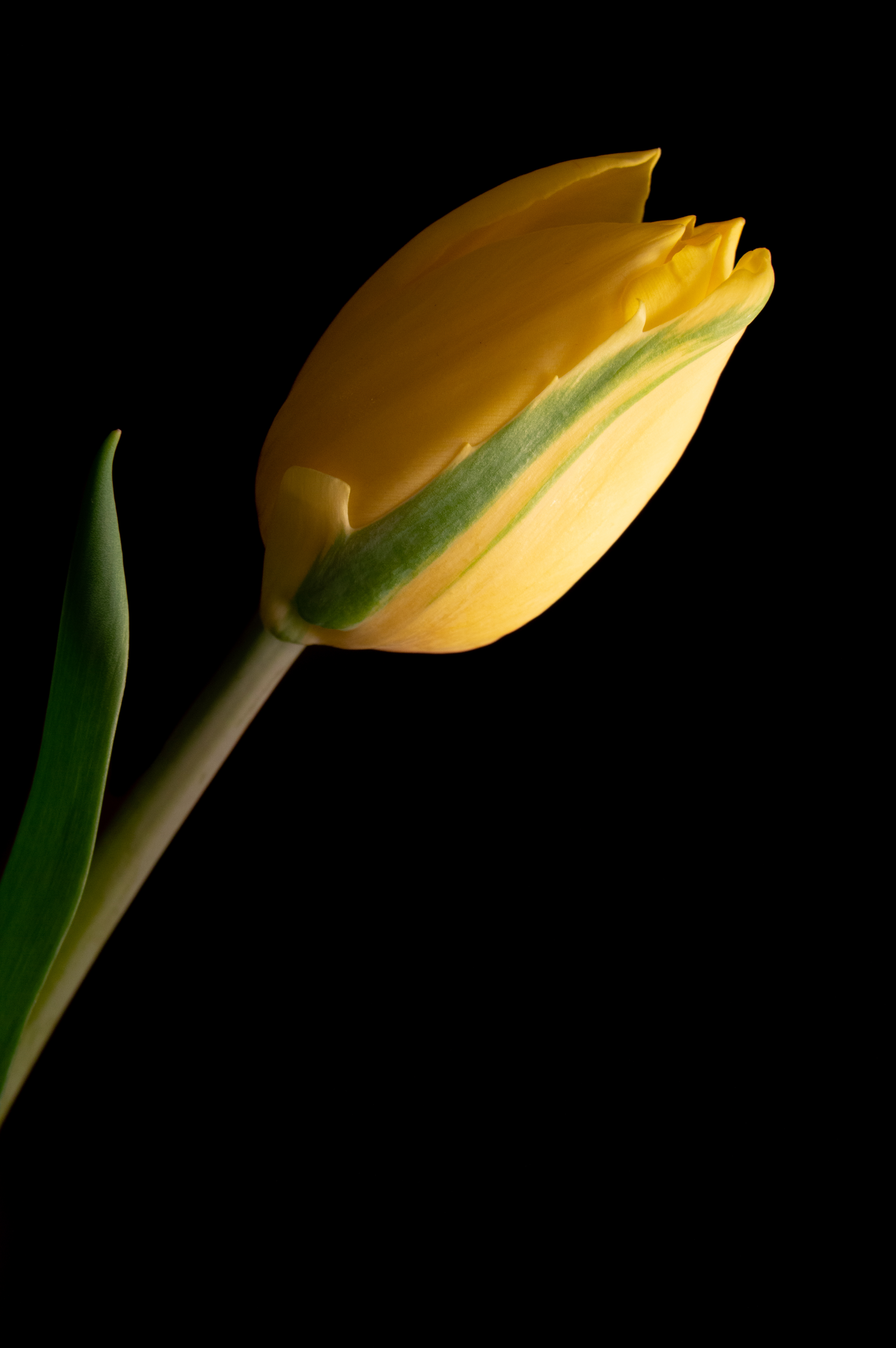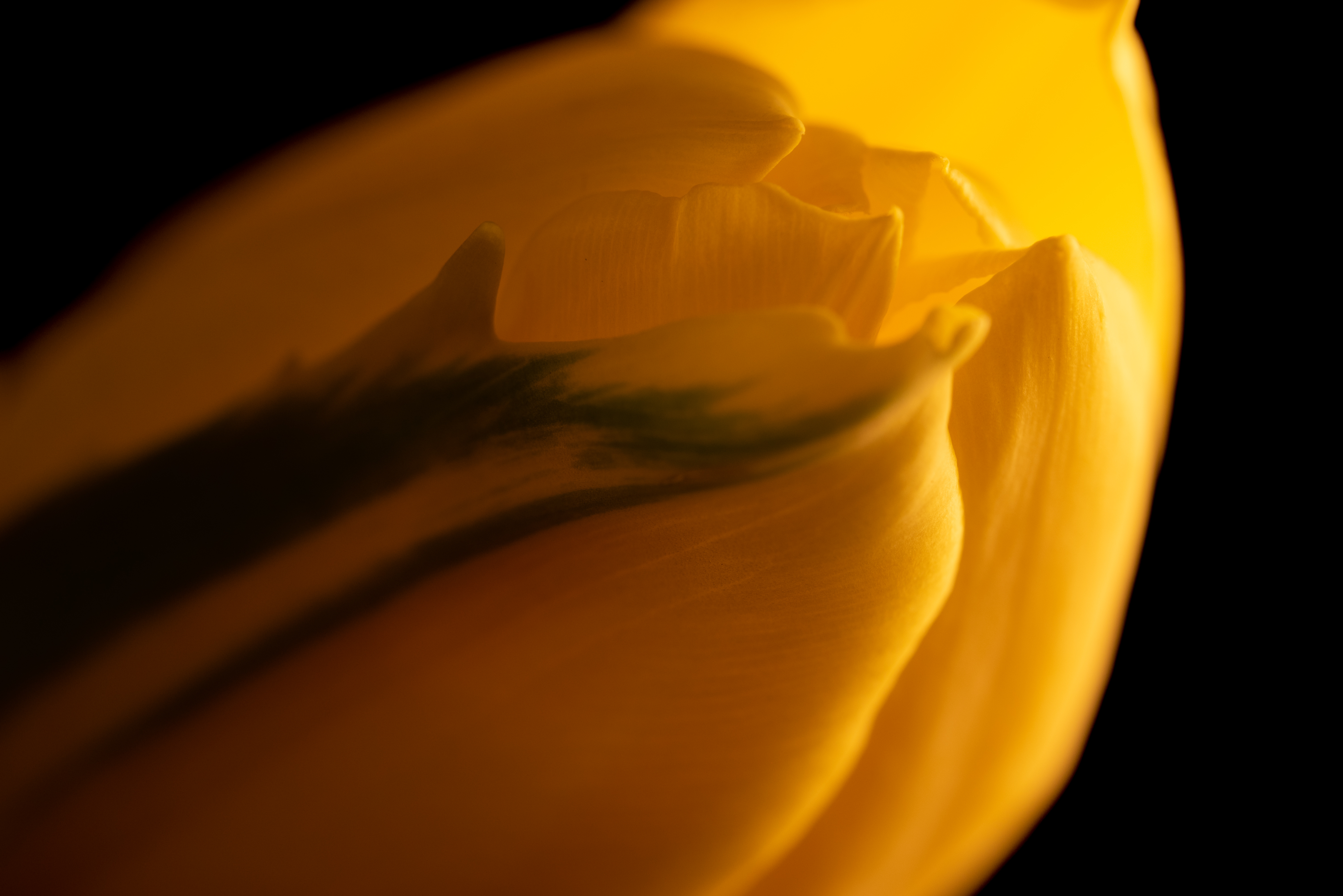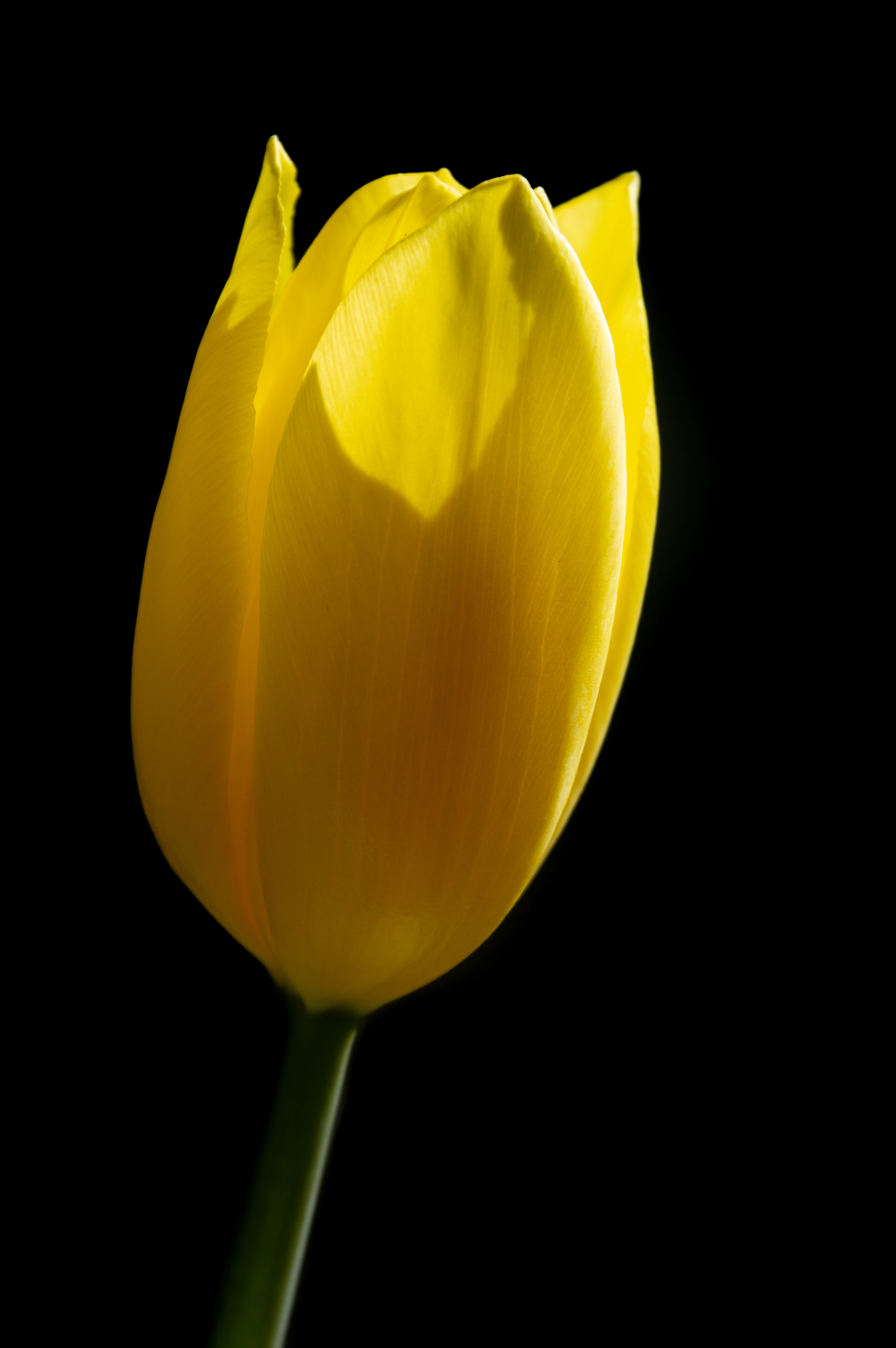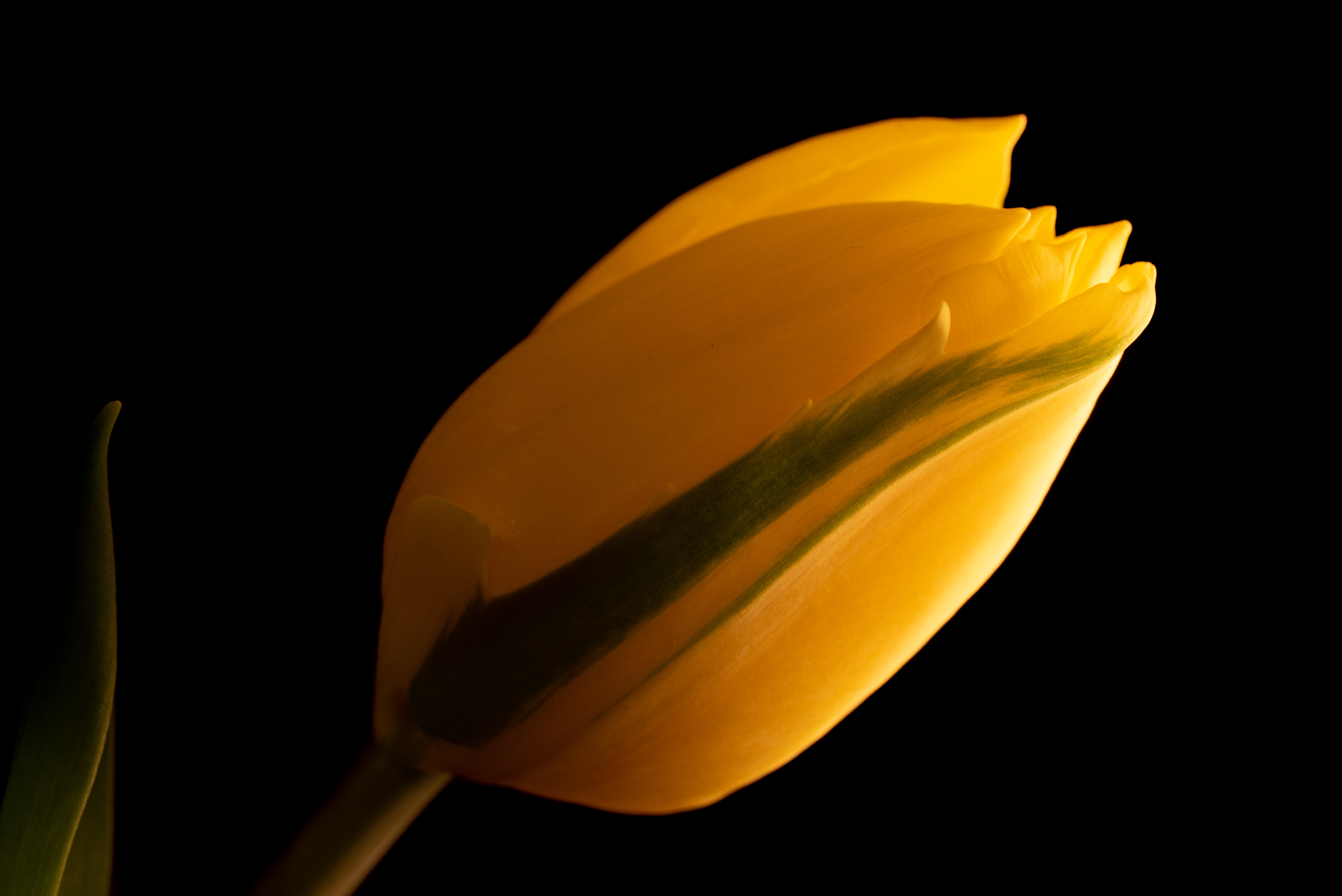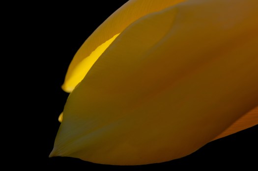 I also did the opposite, dimming the dining room lights, placing the light in front of the tulip, and exposing for the brightly lit side, which yielded higher shutter speeds like 1/160 second and nearly blacked out the background. For several of these I edited the images in Lightroom with an auto-masking brush to bring the backgrounds to complete black. I switched to off-camera flash and achieved the same effect (though less reliably) in mid-day light at f/11, ISO 100, and 1/250 second exposure.