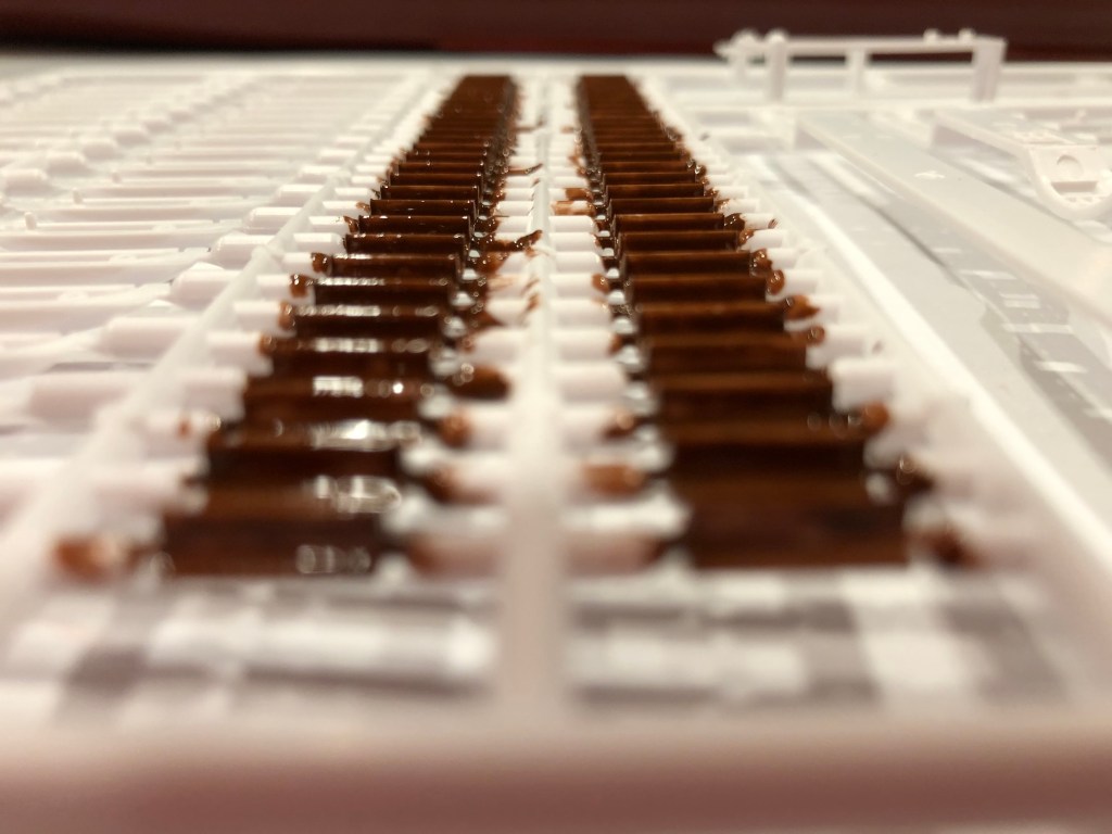To remedy this, I batched my painting. I spent a couple days just painting all of the decks with 3-4 coats of brown, a day painting all of the benches, an hour painting black on all of the smoke stacks, and countless other hours batching paint across the entire model. I painted parts that I wouldn’t need until the end just because they were the current color I had open. It made the beginning of the process pretty slow but has started to show an advantage towards the middle. This process creates distinct phases – sometimes I’m just painting a coat, waiting for it to dry, painting another, switching colors, and then doing it over again across ten different parts. Other times I’m just cutting and gluing parts. The result is that sometimes very little construction happens on the model and then suddenly a bunch of things are suddenly complete.