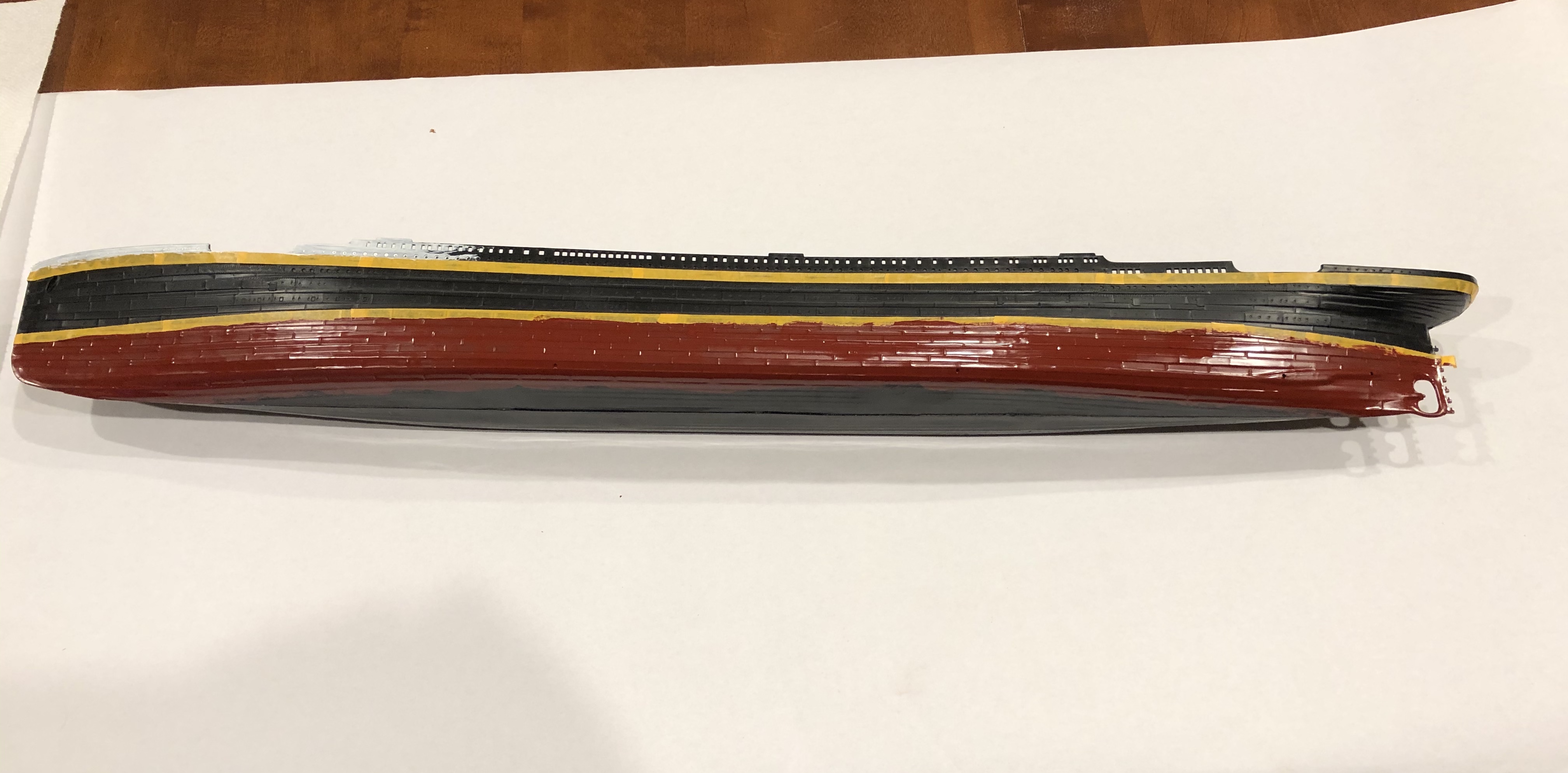 I started the model in January and have stuck to my goals since. My model is very much an amateur model, but it is the best I’ve ever done. And it’s taken a lot of work. I hand-painted the hull red, white, and black (even though the plastic was already black) and it took me a couple of weeks. The white deck took 8 coats for full coverage and the antifouling red under the water line took four. I smartened up when I painted the parts for the white superstructure and used spray paint instead – much faster with much better coverage.