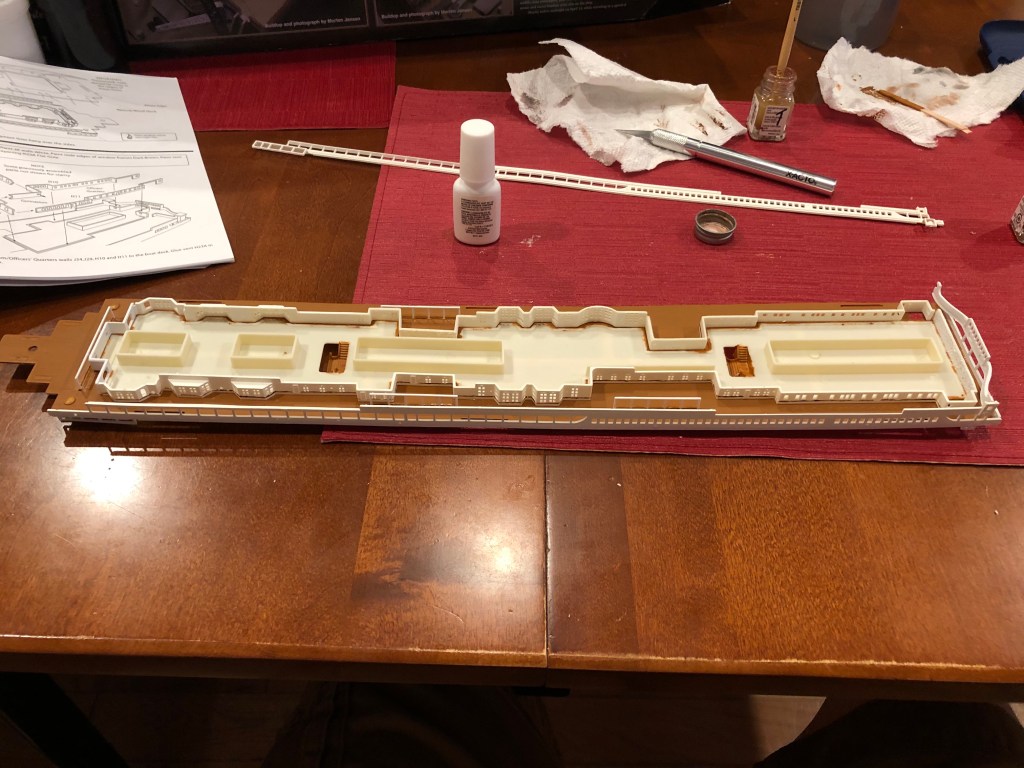 - Test-fitting pieces before gluing them is very important. I have an entire deck that isn’t quite aligned correctly that I had to shave down a bit. I learned my lesson and started test fitting and shaving before gluing. The result has been a lot of tiny detail work with Xacto knives and a few cuts on my fingers.