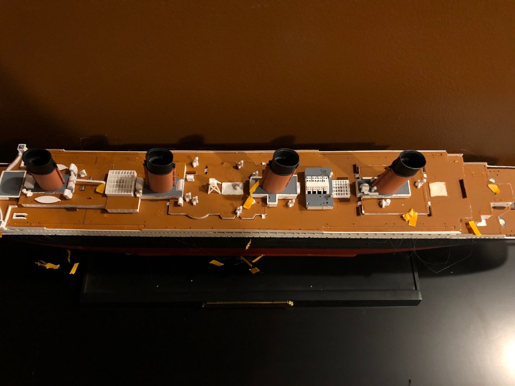 It’s been quite an experience so far. I’m probably 75% through the major features of the ship but only 50% through the details. It’s taken me 35 – 40 hours. I’ve got the majority of the hull, the superstructure, the bridge, four of the funnels, and the majority of vents and machines on the deck. The superstructure isn’t glued in place yet, doesn’t have any railings (there are a lot), the rigging isn’t complete and the bow and stern aren’t done.