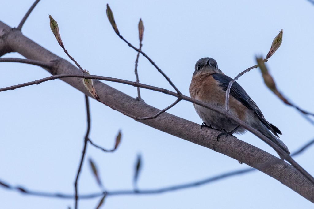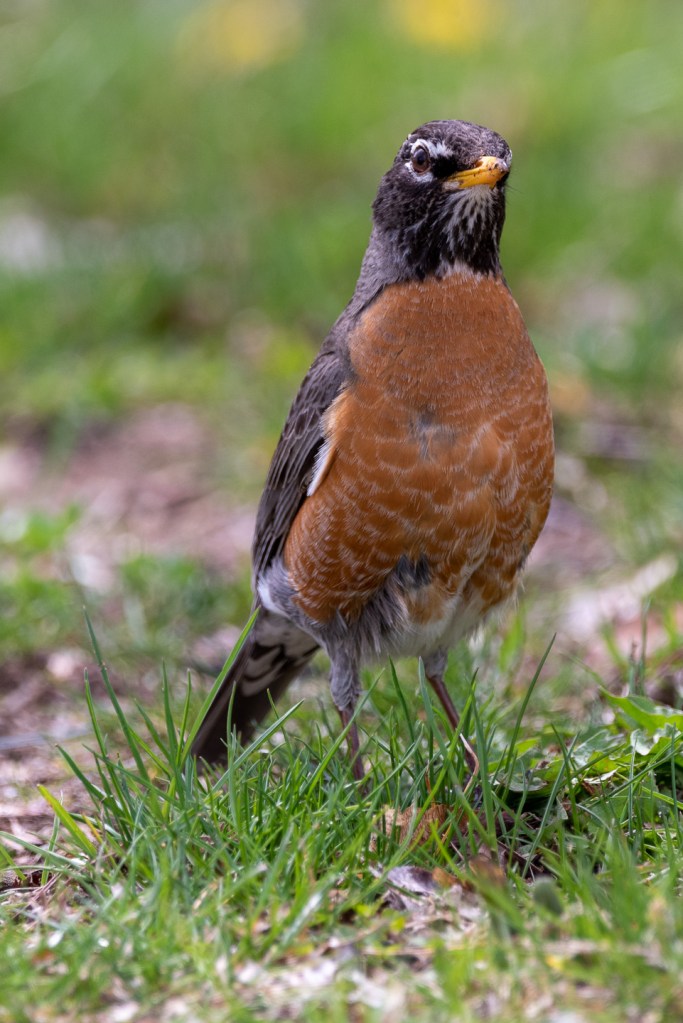 - Getting at eye-level with the bird to create a much smoother background and more flattering angles. This one is very difficult to do as birds are often up in trees, so I still take photos pointing upwards when I have no other choice. Sometimes I can get on a hill to get eye-ish level with a bird on a low branch and other times birds (particularly Robins) land on the grass and I can get them at eye-level. I used to take a lot of shots pointing down towards birds in the grass and I’ve largely stopped doing that since I can just bend down to get a much better angle.