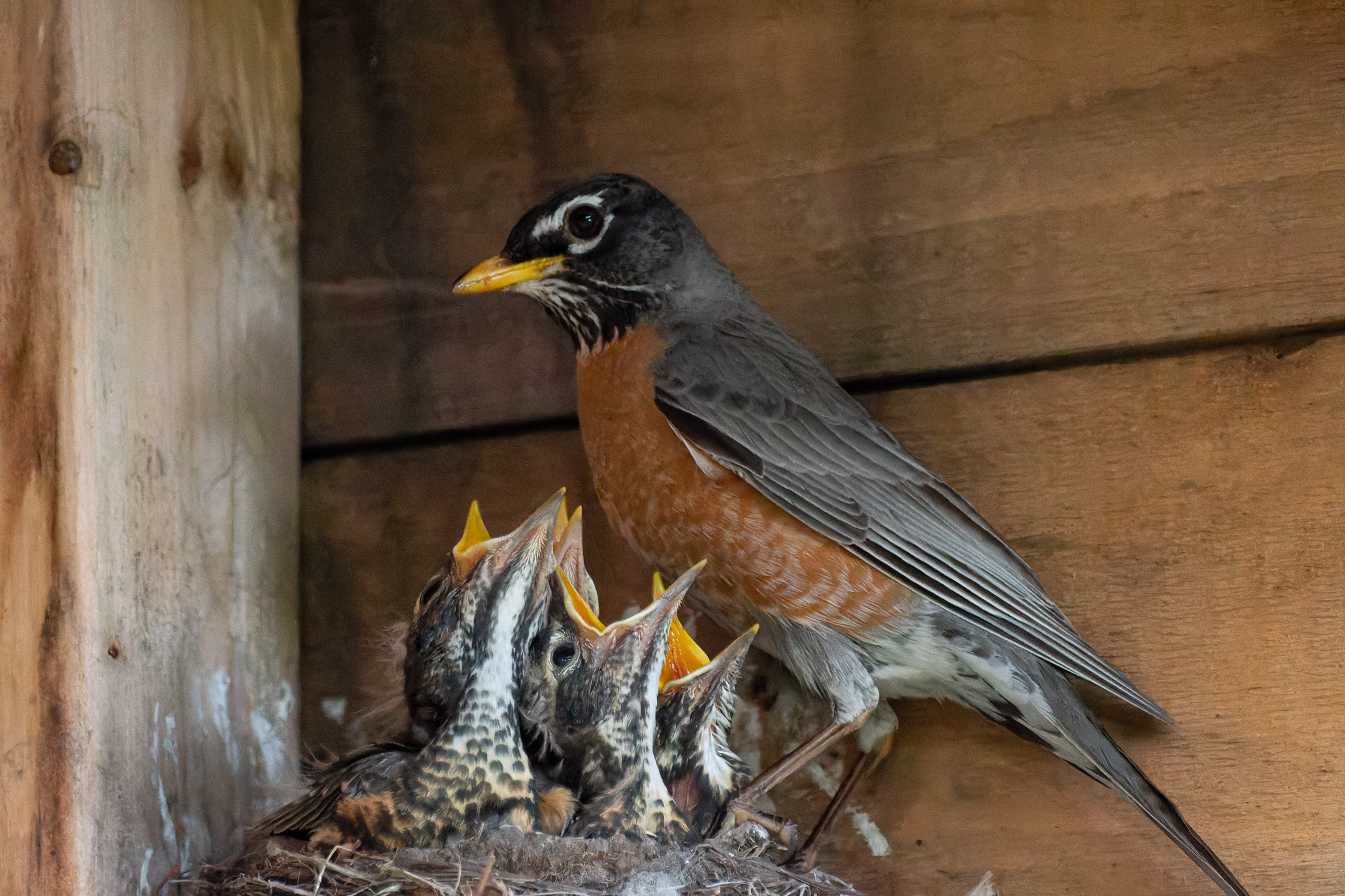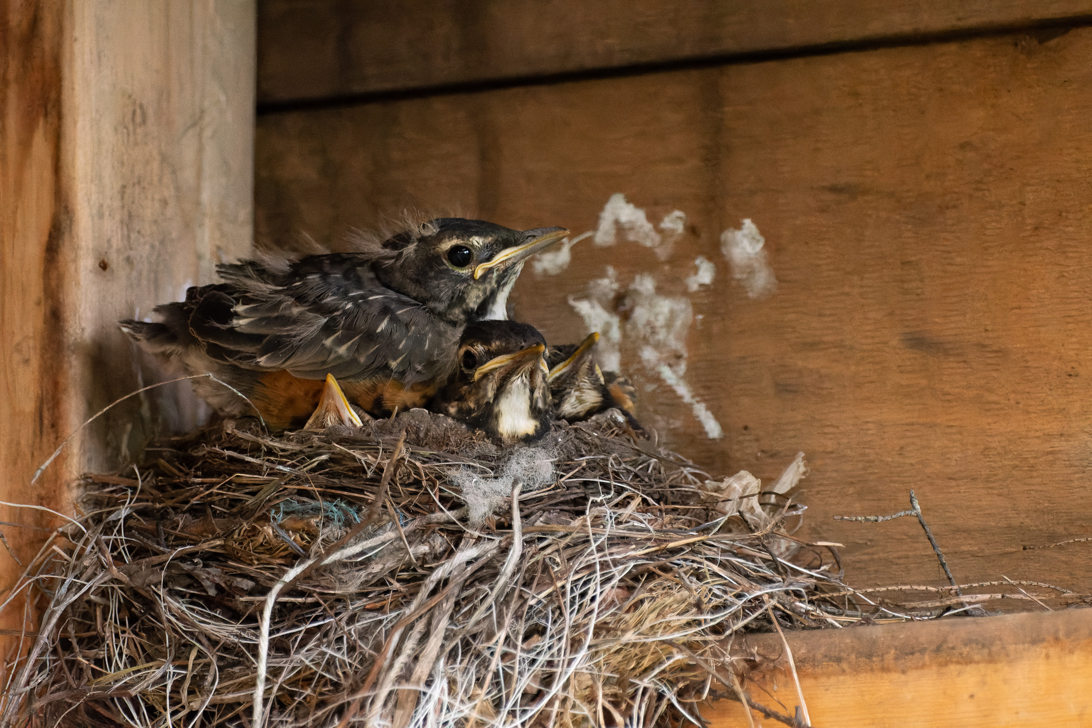 The next couple are of an adorable nest. It was late in the day, so these images were taken at ISO 36,000 on my D500 and subsequently de-noised by PureRAW. I missed the parent feeding the babies, but I got it as it flew away and tried to bring back some worms. I was too close to the nest and freaked it out a bit, resulting in the third image of it flapping its wings. I realized I was too close at that point and moved away.
