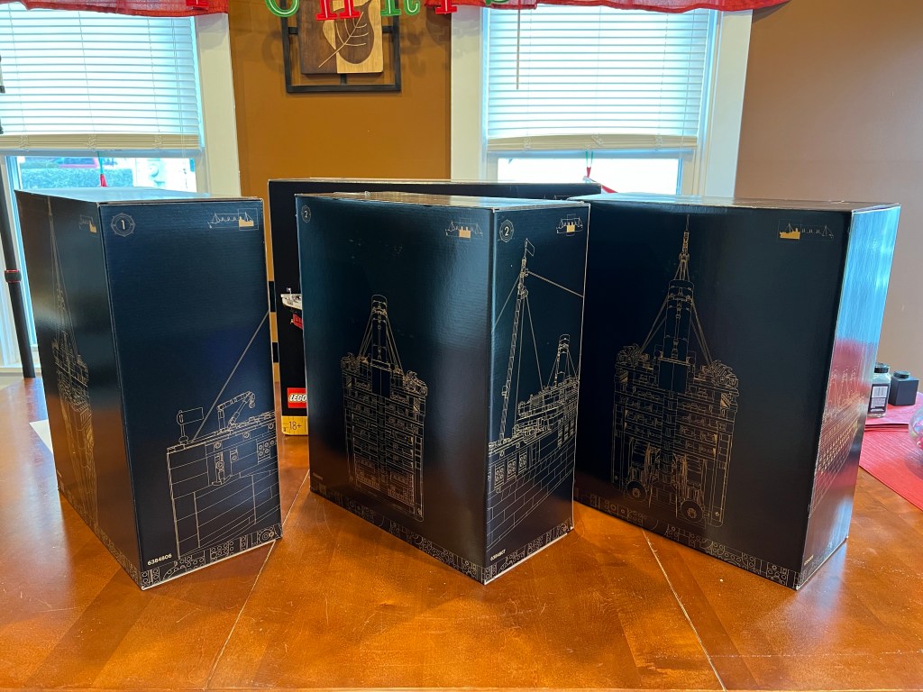 The set is 9090 pieces, and once completed, will be about 4.5 feet long, yes feet. The ship is separated into three pieces that are held together with hidden pins. They are designed to come apart to show some of the inside of the ship. The set comes in a large semi-square box which has three separate boxes inside of it, one for each part of the ship. Box 1 is all about the first 40% of the ship, all the way to the first funnel.
