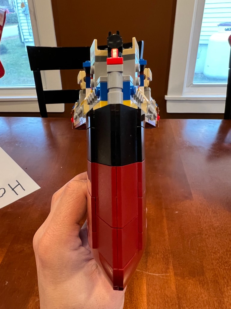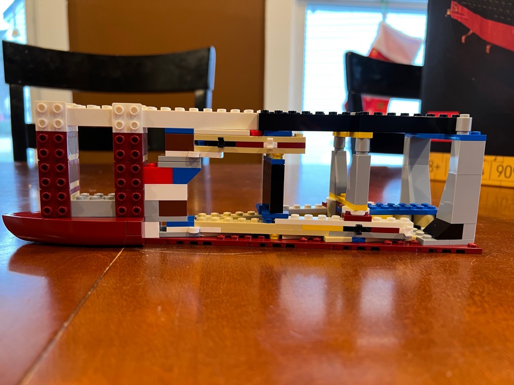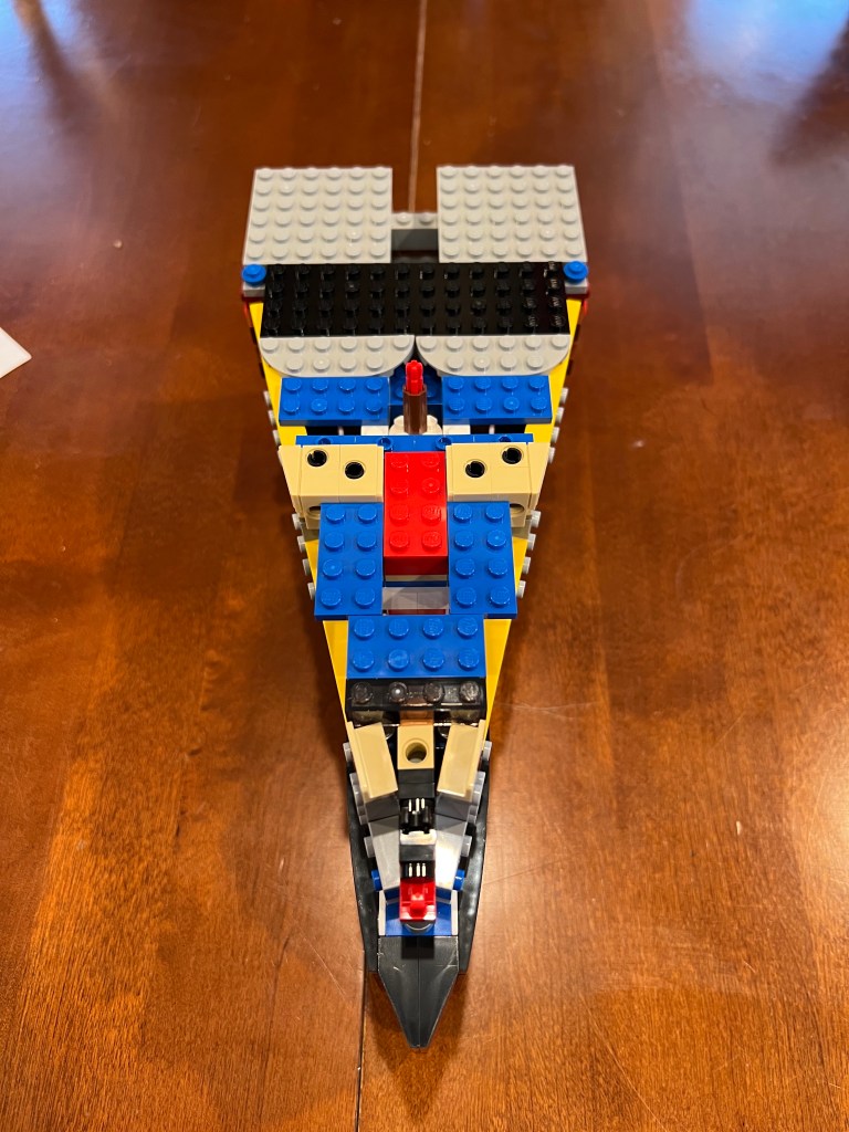 The techniques on the bow have been pretty unique due to its triangular shape. There are a lot of hinged pieces that connect together to make a wedge, as well as inverted and upside-down pieces to eventually connect the sides to. As is typical with Lego, the structural pieces that you can’t see from outside are done in odd colors like blue, red, and yellow. I think they actually do this to make it easier to build as it would be difficult to find different pieces if they were all gray or black.