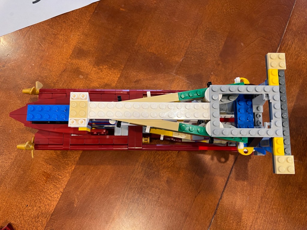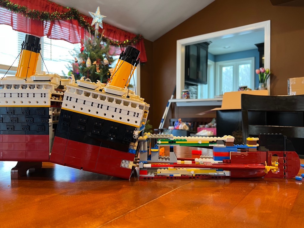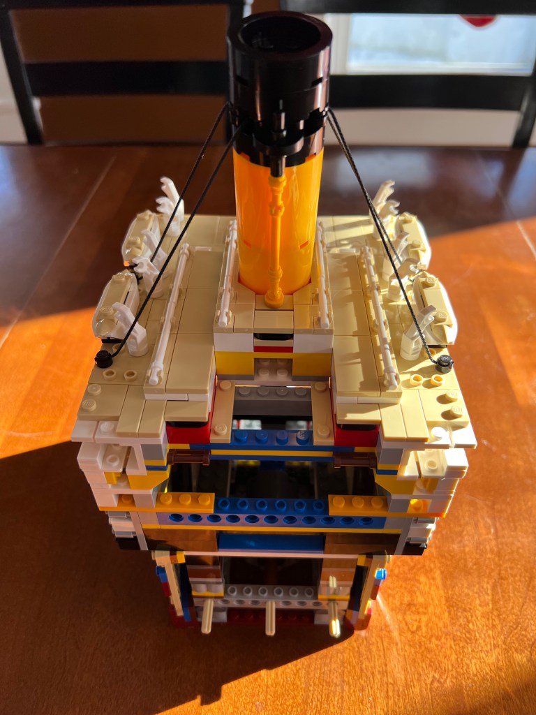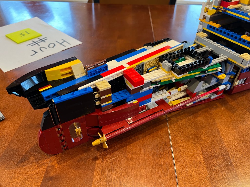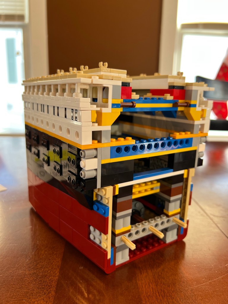 I am nearing the end of my journey to build the Lego Titanic. I’m deep into hour 16 and have made it to the last portion of the back section. Yesterday I finished up the first unit, which houses the fourth funnel, the aft Grand Staircase, the reciprocating engine bays, and the beginning of the shafts that will turn the propellers. Today I focused on the second unit which narrows to form the rudder, terminates the superstructure, and forms the poop deck.