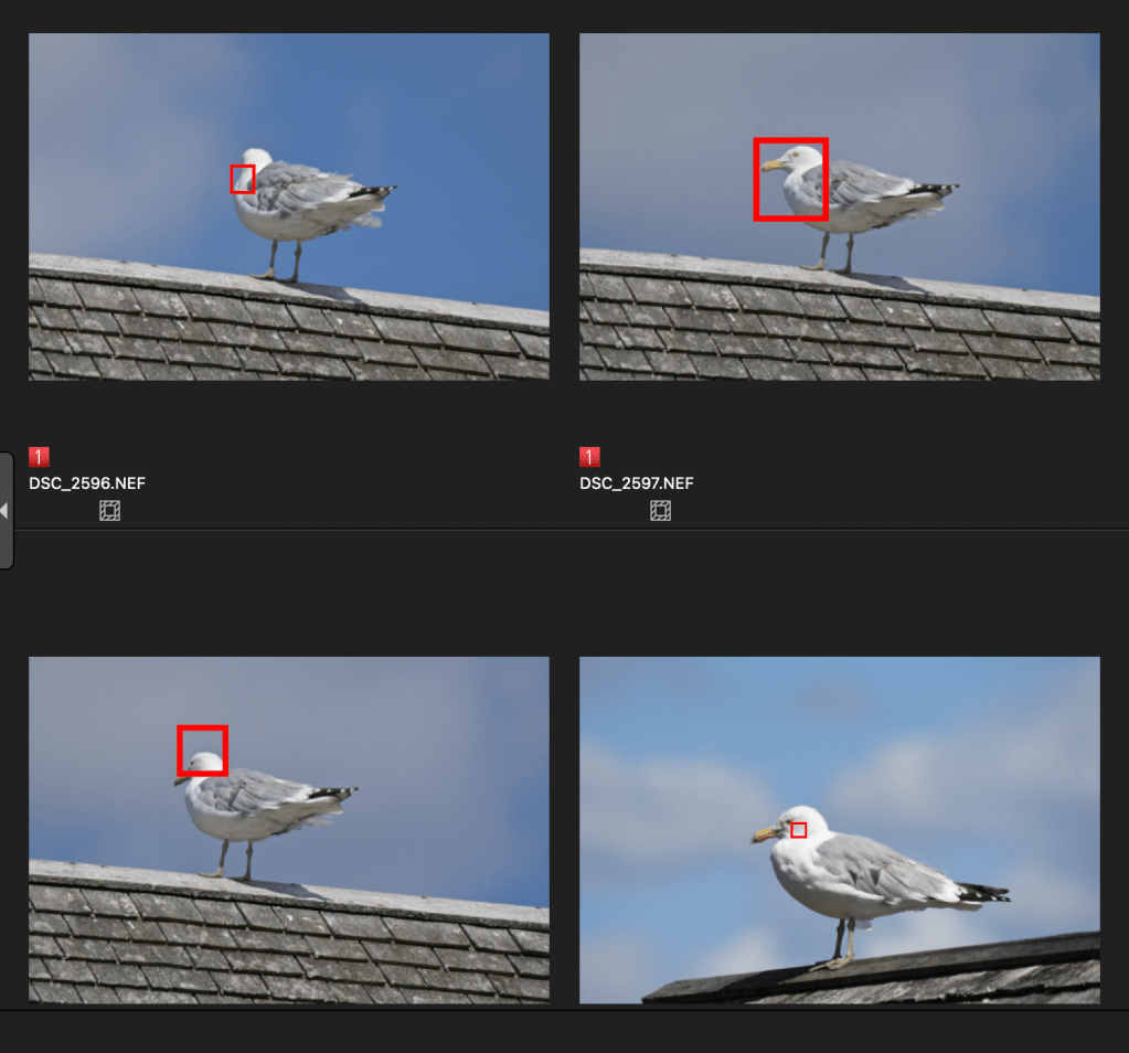 I switched to wide area mode and that was somewhat better because I could choose my subject, but both the large and regular boxes were still too big to do what I ultimately wanted. They also took forever to move across the frame, making it difficult to compose before the seagulls moved. I switched to subject tracking mode because it was faster select and recompose. That worked better, but the camera would randomly lose focus on my selected seagull as it likes to do, even though they weren’t moving! I tried dynamic area for a bit but it didn’t seem to be much better and took even longer to move around because it was so small.