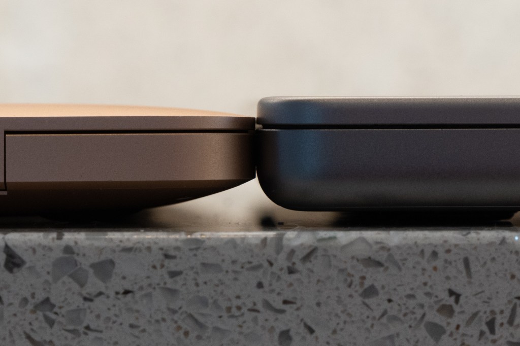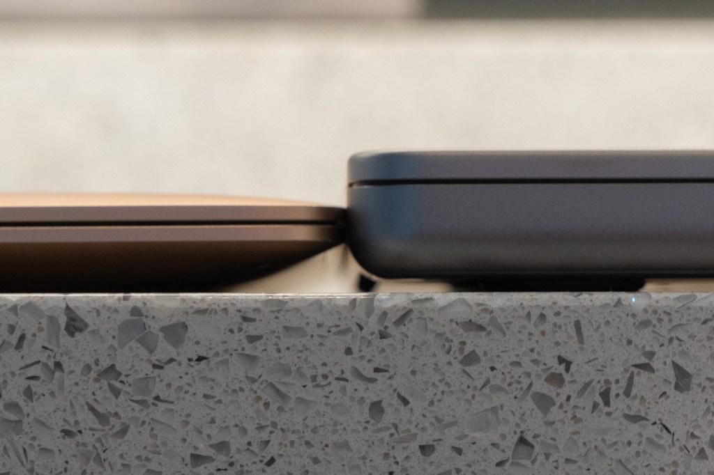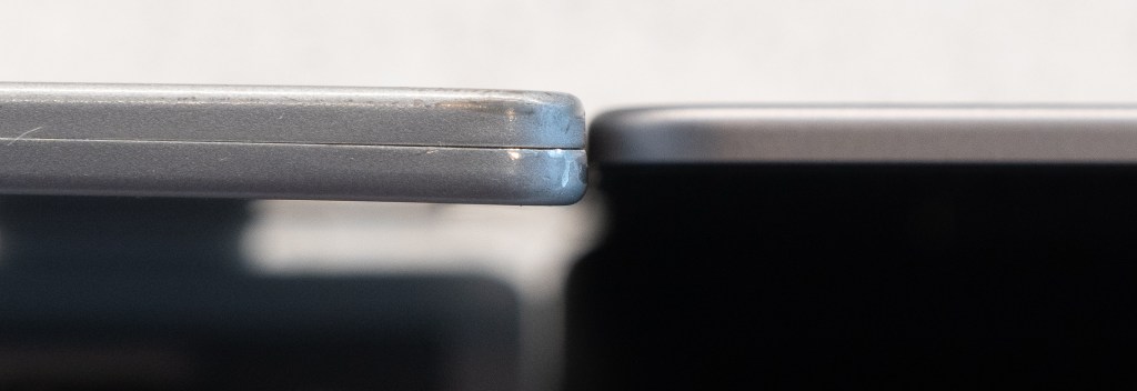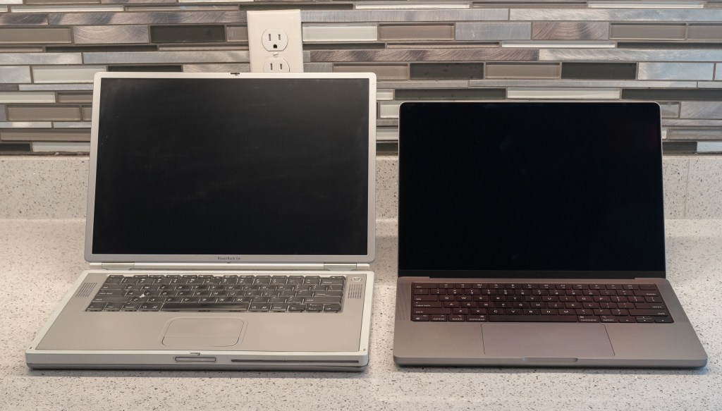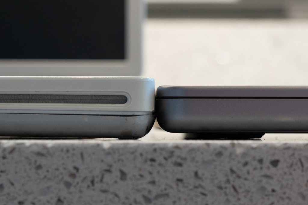 The Pro is certainly thicker, at least compared to the tapered front of the Air, but the back is about the same. Overall I prefer the constant thickness to the Air’s tapered shape – it always felt unbalanced and back-heavy when I picked it up. I really like the boxier design – it reminds me of some of my favorite laptops: my 2004 12″ PowerBook G4 (the first brand new Mac I ever purchased) and my 13” Retina MacBook Pro from 2013. The thin screen and bezels also evoke the feel of the Titanium PowerBook G4, a Mac I never appreciated until I bought one for the museum a few years ago.