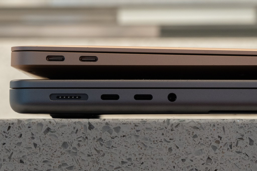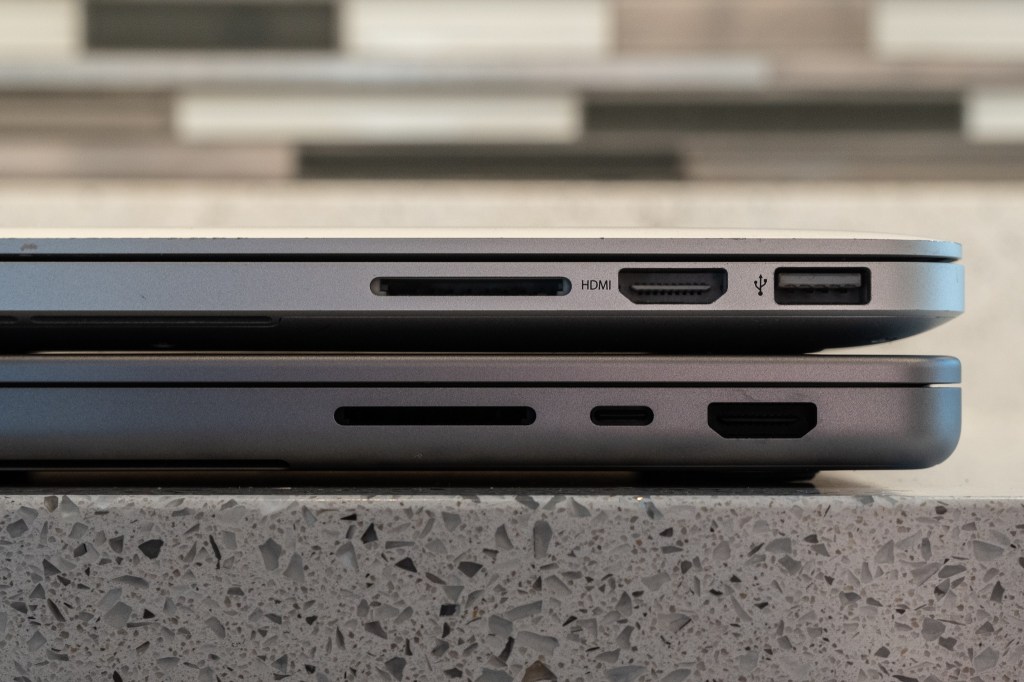 In terms of size, the 14″ MacBook Pro is very similar to my Air, but a half inch wider and deeper. If you stack them on top of one another, the difference is difficult to see; they have to be stacked corner-to-corner to notice. It’s 25% heavier, but the weight is distributed better so the difference feels negligible. The result is something that is just as portable as my Air, but perhaps a tiny bit more comfortable due to the extra width.