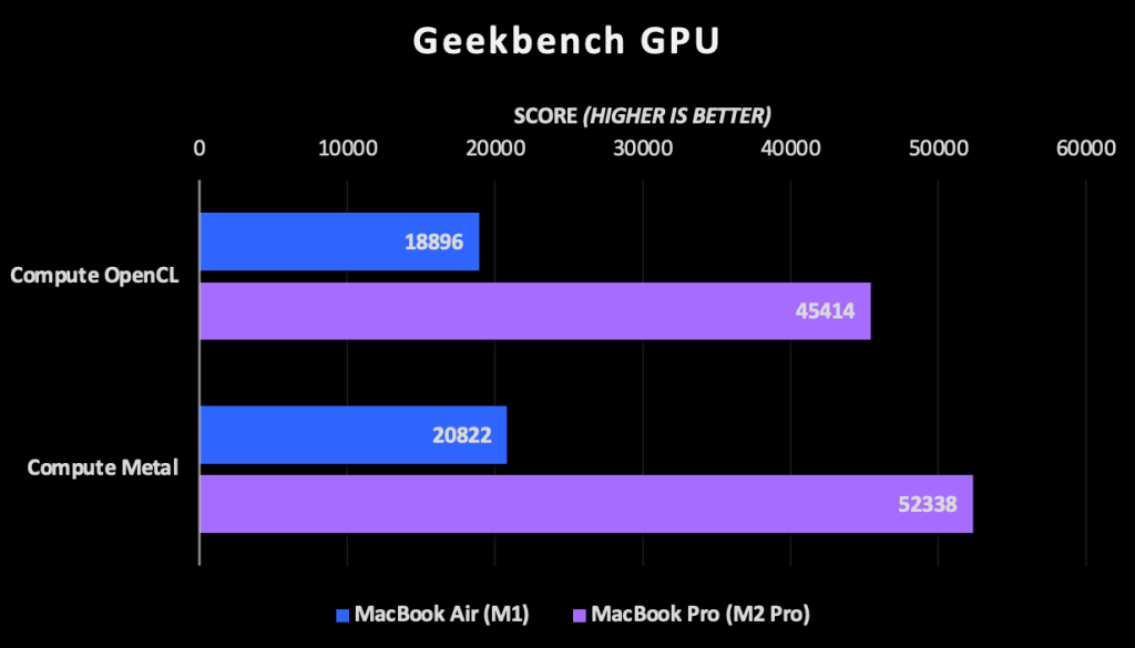 The 2.3 – 2.6x boost in GPU performance isn’t unexpected either. The M2 Pro has more than twice the number of GPU cores of the M1 and each core is around 15% faster. These are great results and aren’t surprising; the M1 is a consumer design and M2 Pro is a performance design.