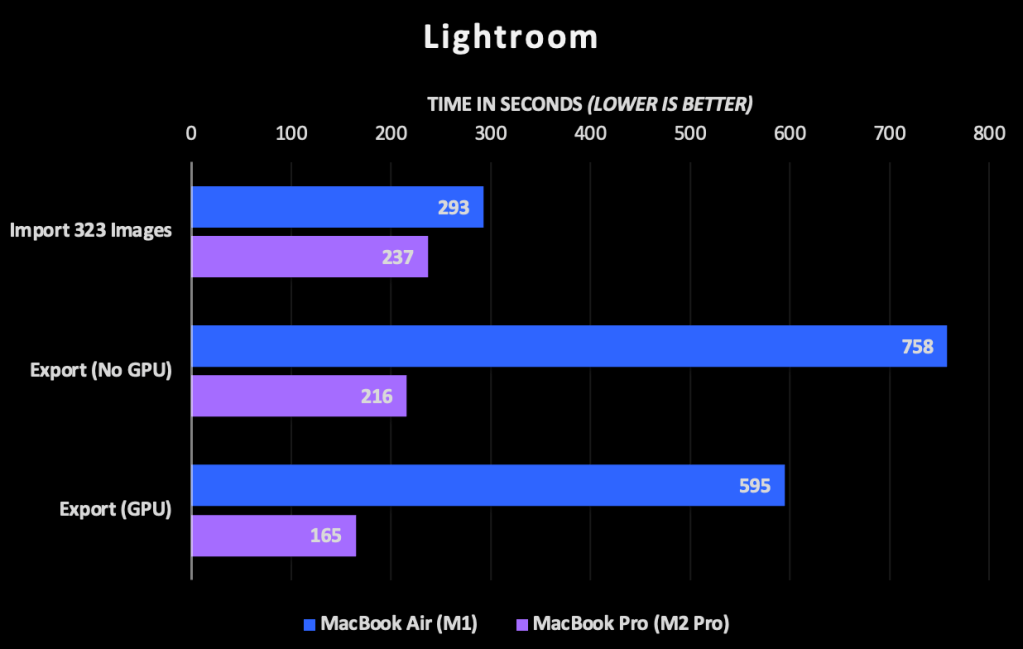 The second test exported those 323 RAW images as JPEG files at 90% quality. In this case the extra power of the M2 really showed as I had expected at about 3.5x faster. This test was done without Lightroom’s recently-added GPU acceleration. Enabling GPU acceleration shaved 27% of the time from the MacBook Air and about 30% from the Pro. I’m surprised this doesn’t provide more of a boost – it either shows how strong the extra CPU cores in the M2 Pro are or it shows that Adobe still has some optimization to do with its GPU acceleration. I’d expect 19 GPU cores to be more than 30% faster than 12 CPU cores. Either way, a boost is a boost.