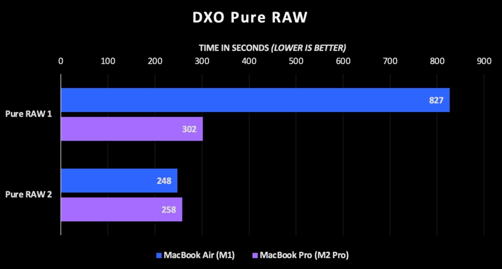 For these tests I ran Deep PRIME noise removal on a batch of 17 Canon R5 RAW files (45 MP) and 1 Nikon D800 RAW file (36 MP). The results for Pure RAW 1 are as expected, with the Pro coming in 2.7x faster than the Air due to its more than double GPU cores. Interestingly I didn’t see any memory pressure issues in this test even though the Air only has 8 GB to work with and it’s shared across the CPU and GPU.