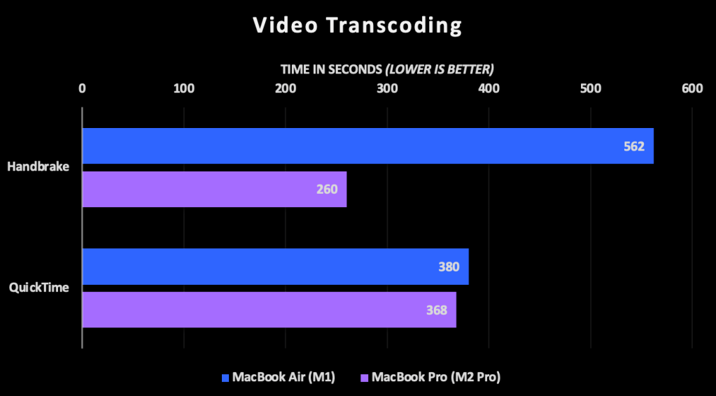 The final test was to transcode 4K videos into the H.265 compressed format using Handbrake and QuickTime. There was a drastic difference in the Handbrake test, with the M2 completing the work a little over twice as fast. QuickTime was a different story, with the Pro only beating the Air by about 3%. I think that has to do with the way QuickTime handles transcoding – I barely noticed any CPU or GPU utilization on either machine.