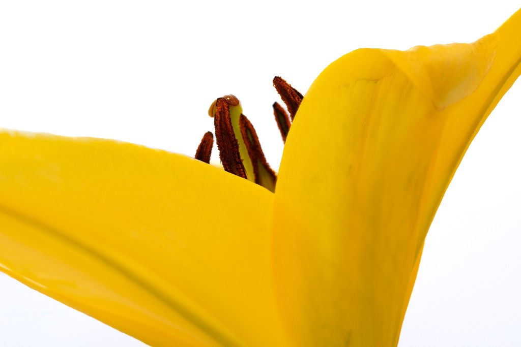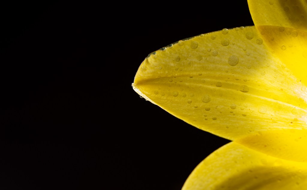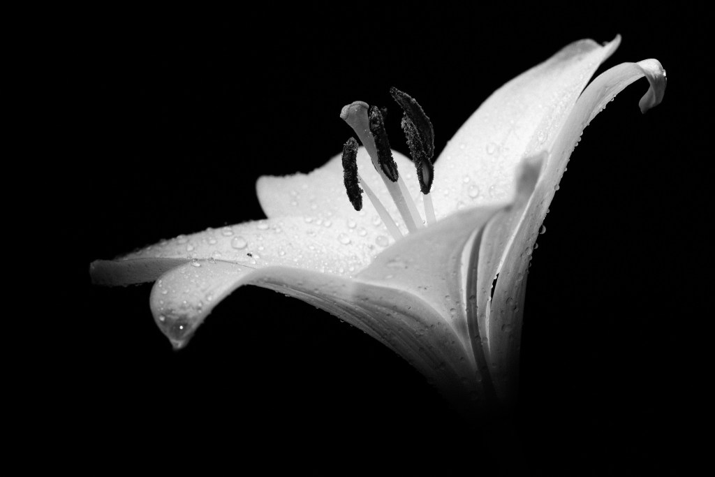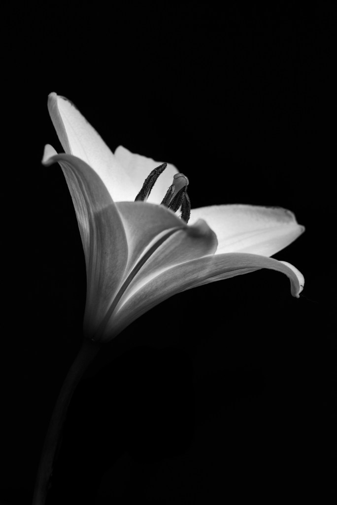 Things started getting really exciting when I converted some of the images to black and white. I took a bunch of photos with a snoot to direct hard light into the center of the lily and used faster shutter speeds (and a black poster board) to black out the background. I just love the way these look. The yellow petals create a great contrast on the background and the backlighting brings out their detail. The water droplets in the last photo look great too! I’m always a fan of high-contrast black and white, especially where the subject gradually appears like the bottom of the lily does. The second image just barely shows its stem while the third shows a hint of a leaf.