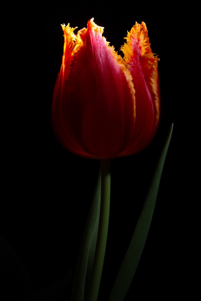 Ok, a couple more of those tulips from my last post that I just finished processing. The black and white image was taken with my macro lens and it came out just great. It lends itself well to a square crop. If you look closely you can see little hairs on the tips of the petals! The color image is actually from the 28 – 300mm lens that took such rough pictures before, but in this rare case the lighting works enough to make it pleasing. I love how crimson the petals look and how the stem and leaves creep out of the black.