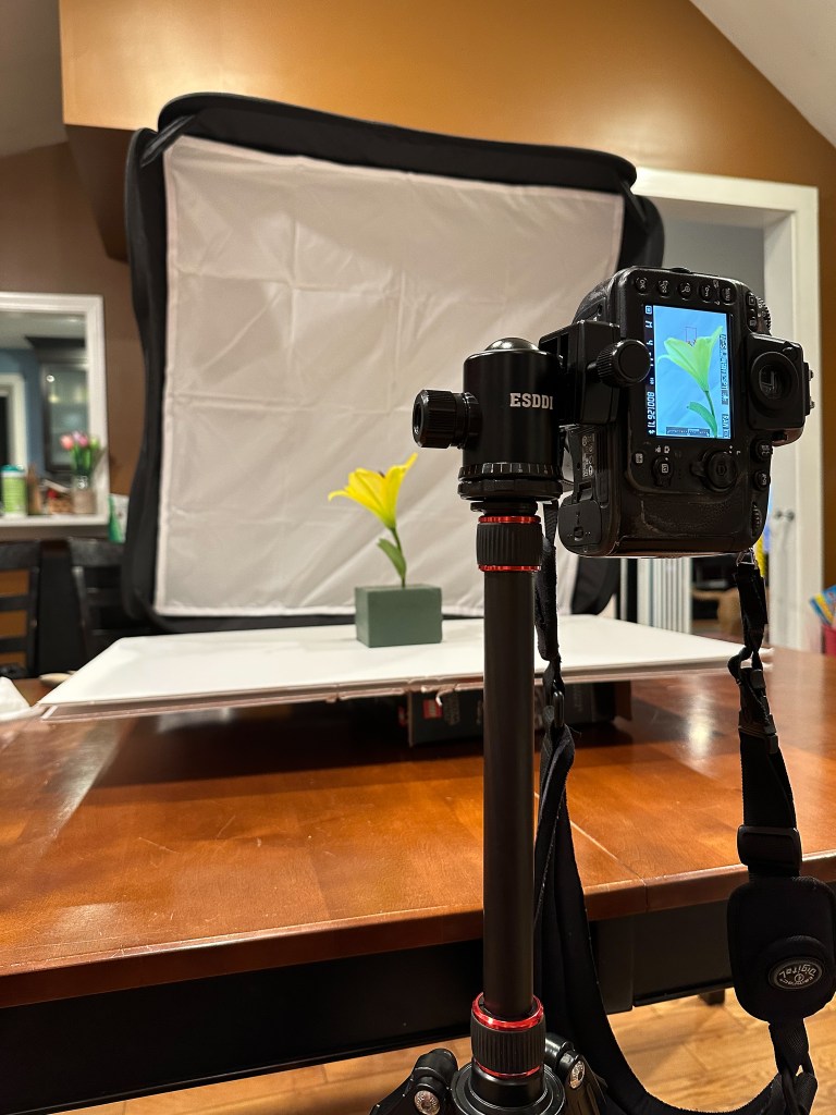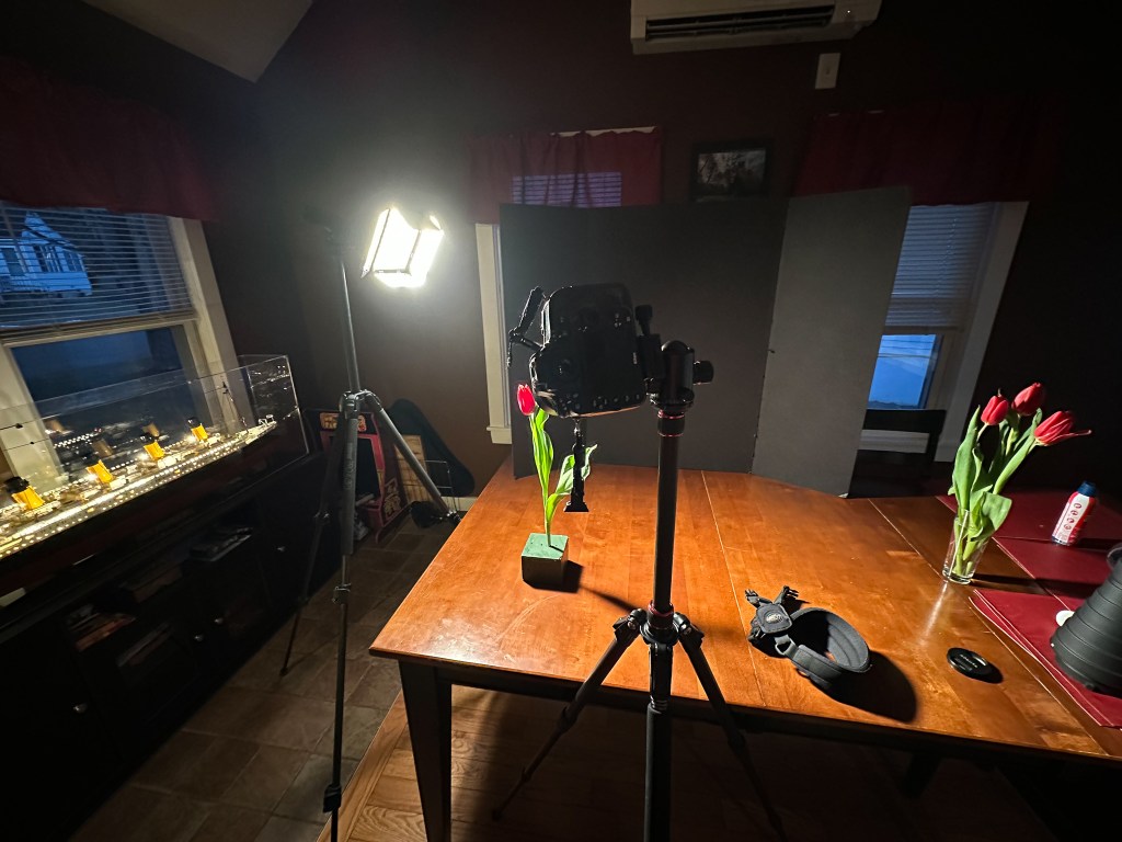 So there you have it, my “studio”. Almost all of the flower photos I’ve taken since 2020, especially those with a black background, have been made here in this way. I started with just a florescent bulb and slow shutter speeds, added a Bowens mount for my flash and a softbox several months later, then added the snoot the next year. Since then it has been pretty static, but I’ve got some new equipment on the way. I picked up another SB-700 flash so that I can light both sides of my subject when desired. I had to buy another light stand, another Bowens mount, and another softbox to go with it. I also bought a light tent with a built in diffuser and adjustable LED lights. This might make it a bit easier to grab flower or object photos when I want them to be fully lit.