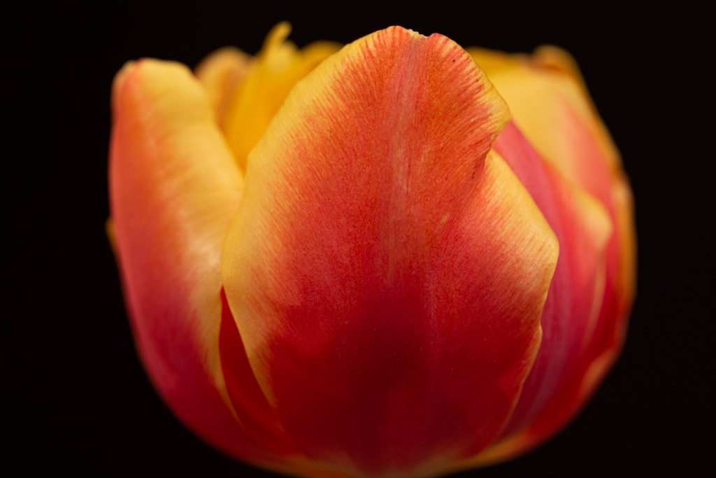 Continuous lighting gave me this great image as well. I used the barn doors on my light to prevent it from illuminating the foam board and turning it gray. It took a while to position the tulip in just the right way. A little bit closer to the camera it would be completely out of the light and black. A little too far and the light would take over the entire picture. After some trial and error I found the Goldilocks position that made this photo.