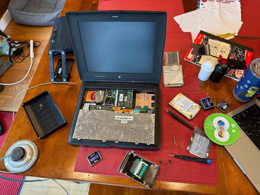 Before taking anything apart, I tested the CF card in a CF PC Card reader on my PowerBook to make sure it worked. It mounted as a PC drive and was readable. I took the opportunity to format it with Apple’s Drive Setup under Mac OS 8.5 and attempt to update its disk driver. If the format or driver update didn’t work, it would be unlikely to boot the PowerBook. Both operations completed successfully, so I thought I’d save myself a system install and copy over the System Folder from my internal drive and bless it to make it bootable. Turns out that perhaps I did have a drive that needed replacing: two separate attempts to copy the System Folder resulted in a loud clunk from the internal drive and a completely frozen Mac.
