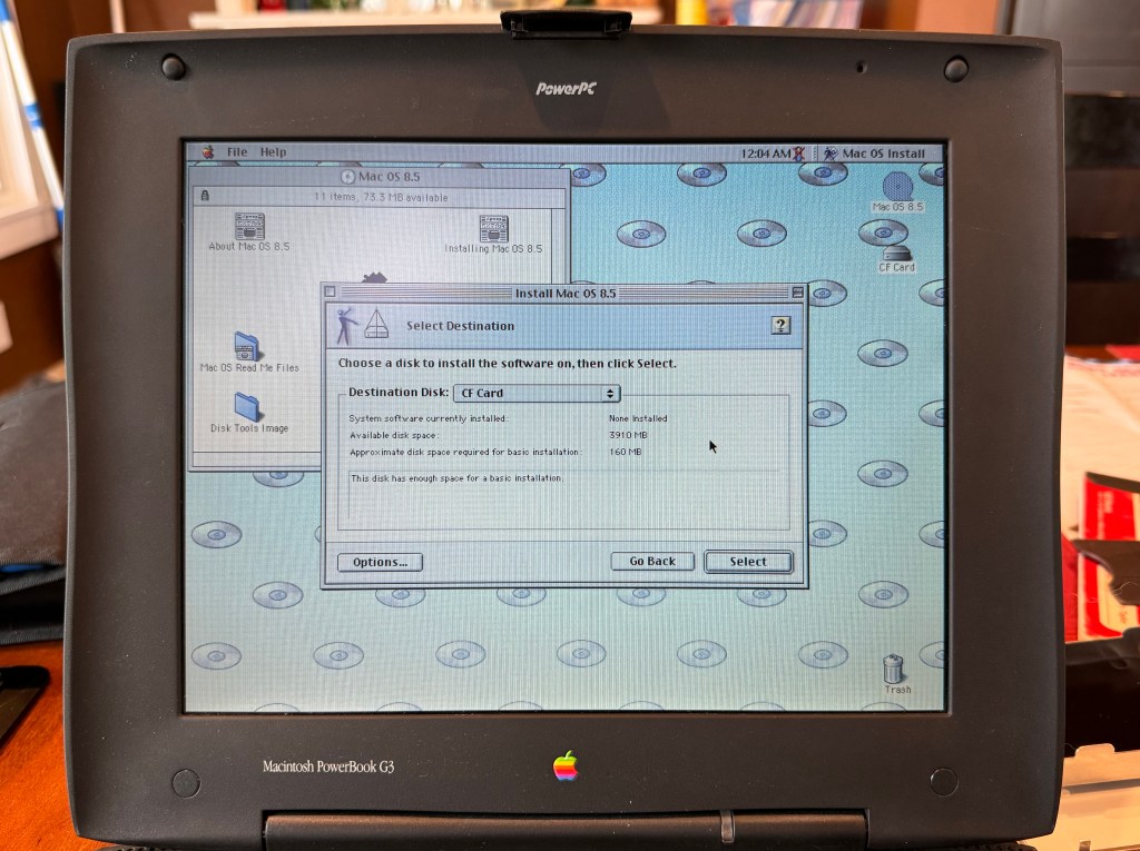 My care paid off and the adapter plugged in with no problem. I booted from a Mac OS 8.5 install CD and saw my CF card on the desktop. The OS 8.5 installer saw the disk and successfully completed the install. I rebooted and, voila, was running my PowerBook G3 off of a silent CF card.