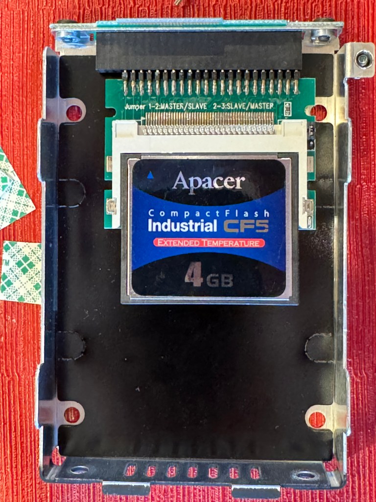 Finding a CF card that supports both fixed disk mode and wear leveling is challenging and it’s not often clear what is supported by various cards. Typically “industrial”-rated cards satisfy these requirements, but not always. Finding cards with this combination of characteristics is part of the reason I didn’t try out my CF to IDE adapter until now.