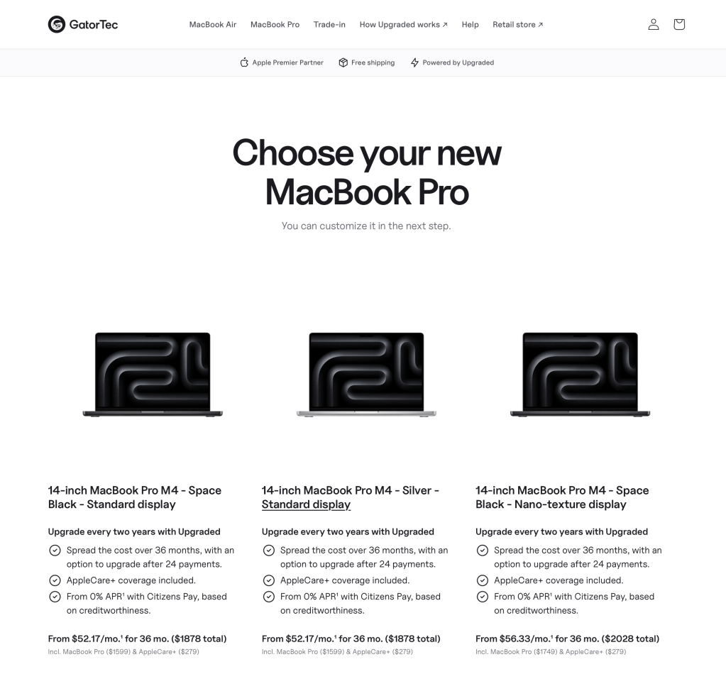 I found out about Upgraded over the summer and decided to keep it in mind for Apple’s fall upgrade cycle. As rumors of an October release approached, I started modeling out the costs of buying a new machine through the service. I modeled an M3 machine, but the pricing turned out exactly the same for the M4. For $138.28 per month I could get a 14″ MacBook Pro with a 16 CPU / 40 GPU core M3 Max chip, 48 GB RAM, and 4 TB storage. I’d pay that for two years (totaling $3,300) and then upgrade to what would probably be the M6 model.