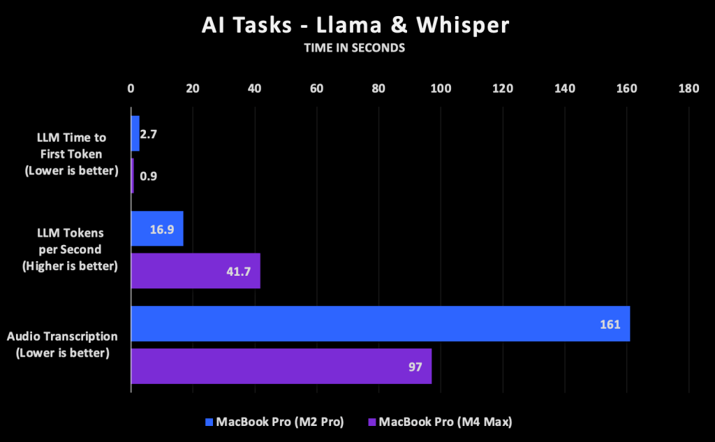 I asked it questions about amendments to the Constitution using LM Studio, which provides handy metrics that I averaged together. In terms of speed, the M4 Max generated the first token of the response almost three times faster and continued generating tokens at over twice rate as the M2 Pro. This test ran completely on the GPU and shows the power of the improved GPU architecture and significant increase in cores.