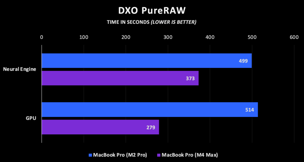 Running the same test using the GPU, the M4 Max performs the same operations about 46% faster than the M2 Pro, which is nearly a 2x improvement. This is where things get interesting with the Neural Engine. On the M2 Pro, the Neural Engine is about 3% faster than the GPU. It’s minimal, but on weaker hardware like my old M1 MacBook Air, it really saved the day. On the M4 Max however, the GPU is still king – de-noising the images about 25% faster than the Neural Engine can. I’m glad I ran that test because Pure RAW’s “automatic” setting selected the Neural Engine on my M4 Max.
