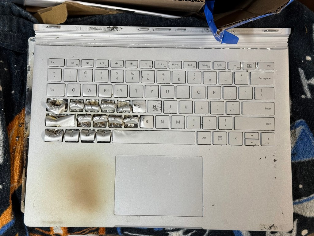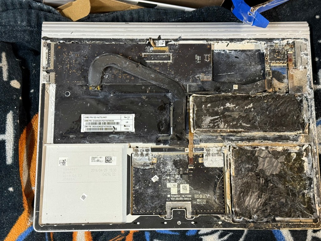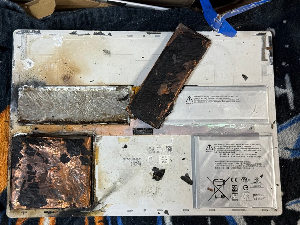 I had a working system except for the trackpad on the keyboard base, so I bought another unit to see if I could fix it. The new base had a working trackpad but a dead battery that wouldn’t charge. I disassembled both to swap the working trackpad into the base with the working battery but ended up causing my first lithium fire.