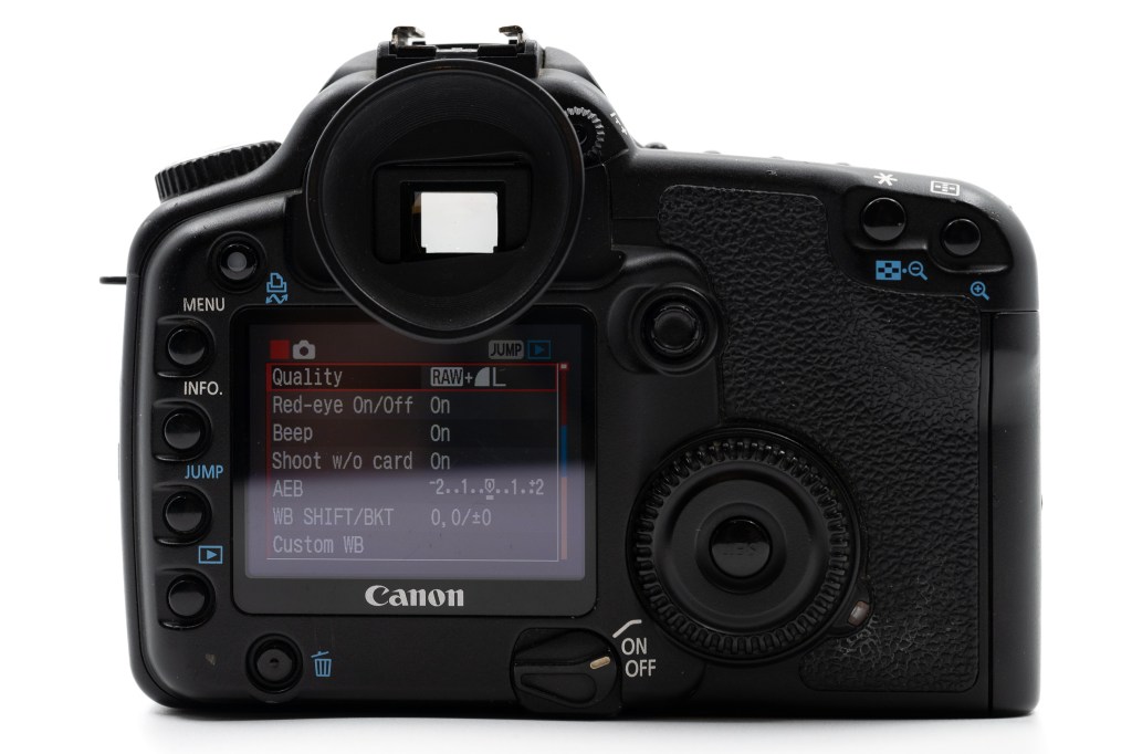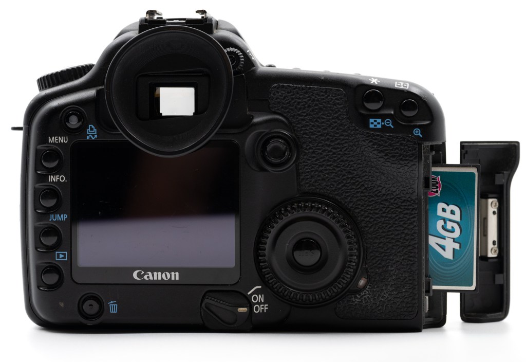 It has nine autofocus points that can be selected with a joystick or automatically and shoots 5 fps for up to 11 RAW or 40 JPEG images to a single Compact Flash card. It has a 2.5” 320 x 240 pixel screen on the back for image review and configuration, but pre-dates live view and video recording by several years. It supports Canon’s crop-only EF-S lenses as well as full frame EF lenses.
