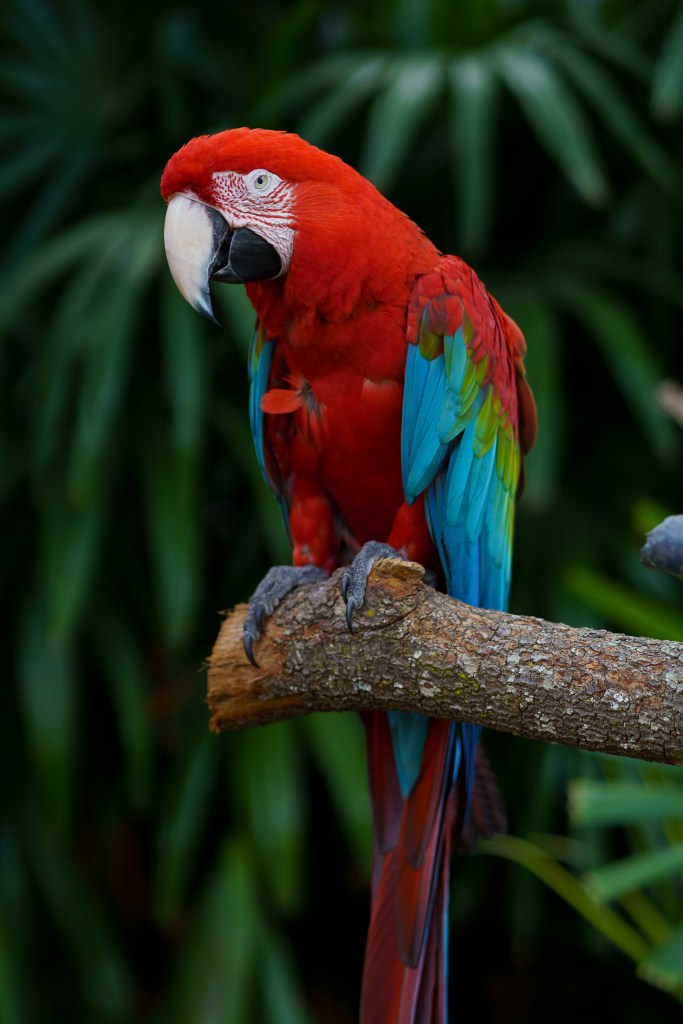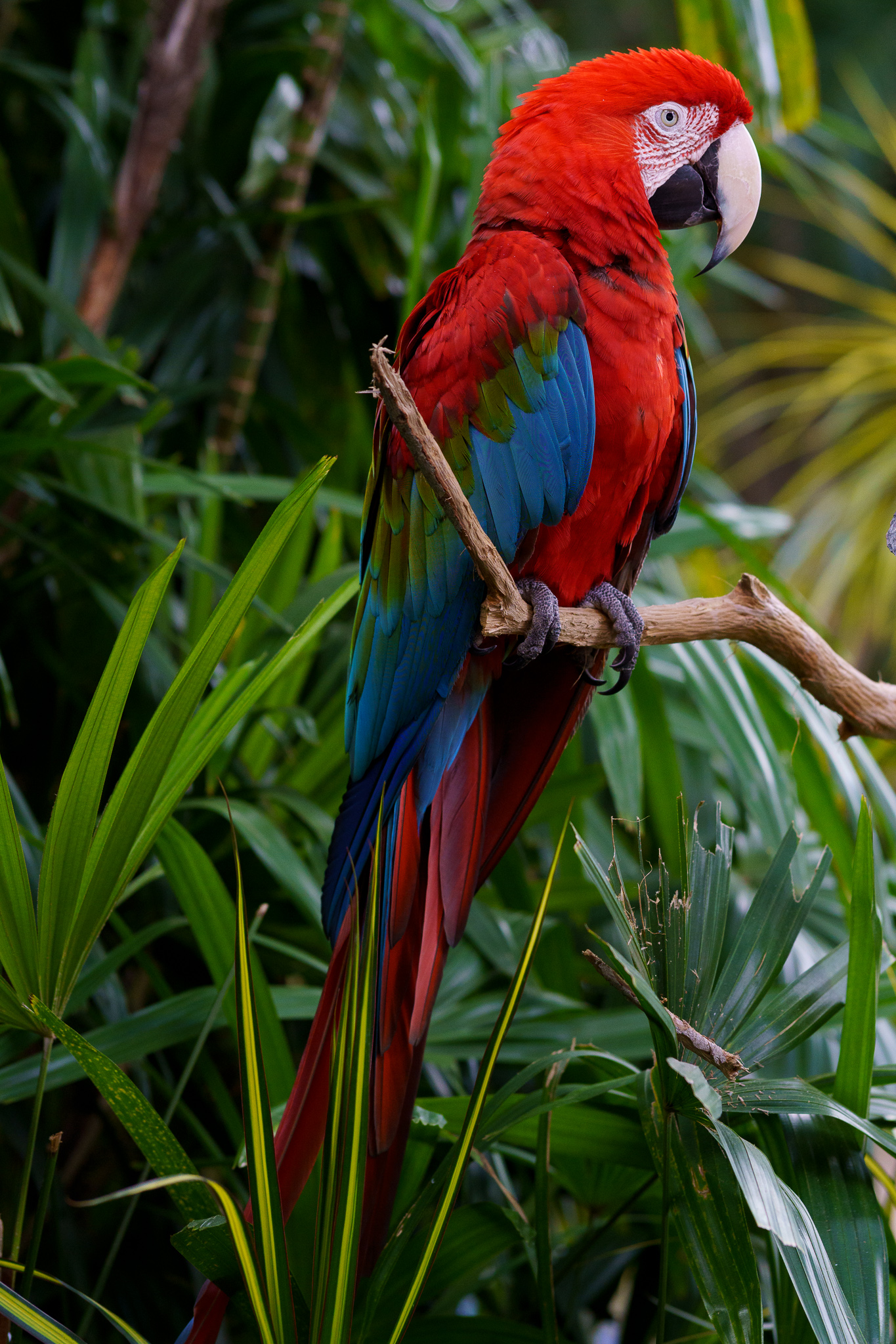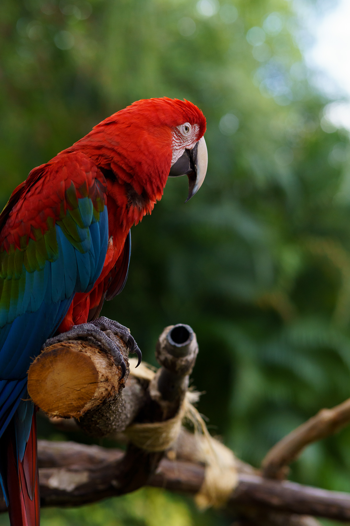 After my flamingo experience, I started moving towards the aviary. As I walked the main path I spotted the two colorful macaws we had seen on the way in. They were in an open enclosure with no annoying mesh or wire to shoot through. I was again able to frame them nicely with only my 75mm f/1.8. The images are sharp, detailed, and the backgrounds look nice.