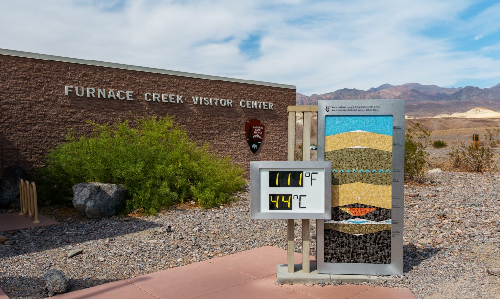 We moved on to the Furnace Creek Visitor’s Center for a quick bathroom and snack break. There’s a cool sign out front that indicates the current temperature: 111 degrees. It was already hot at Dante’s View, but this just confirmed it.