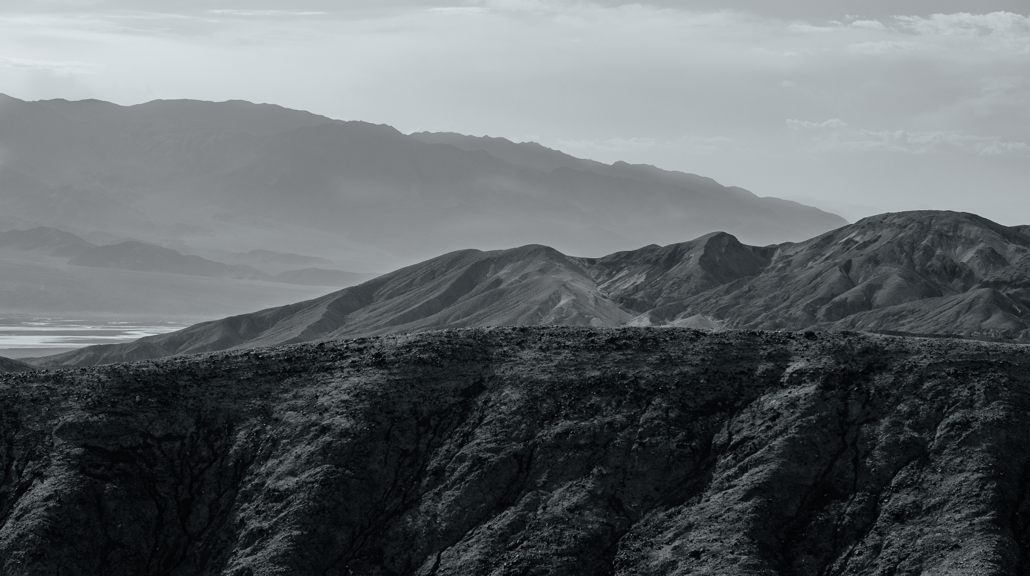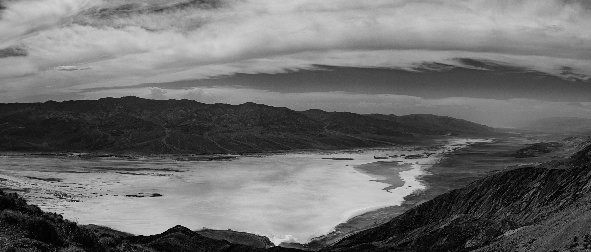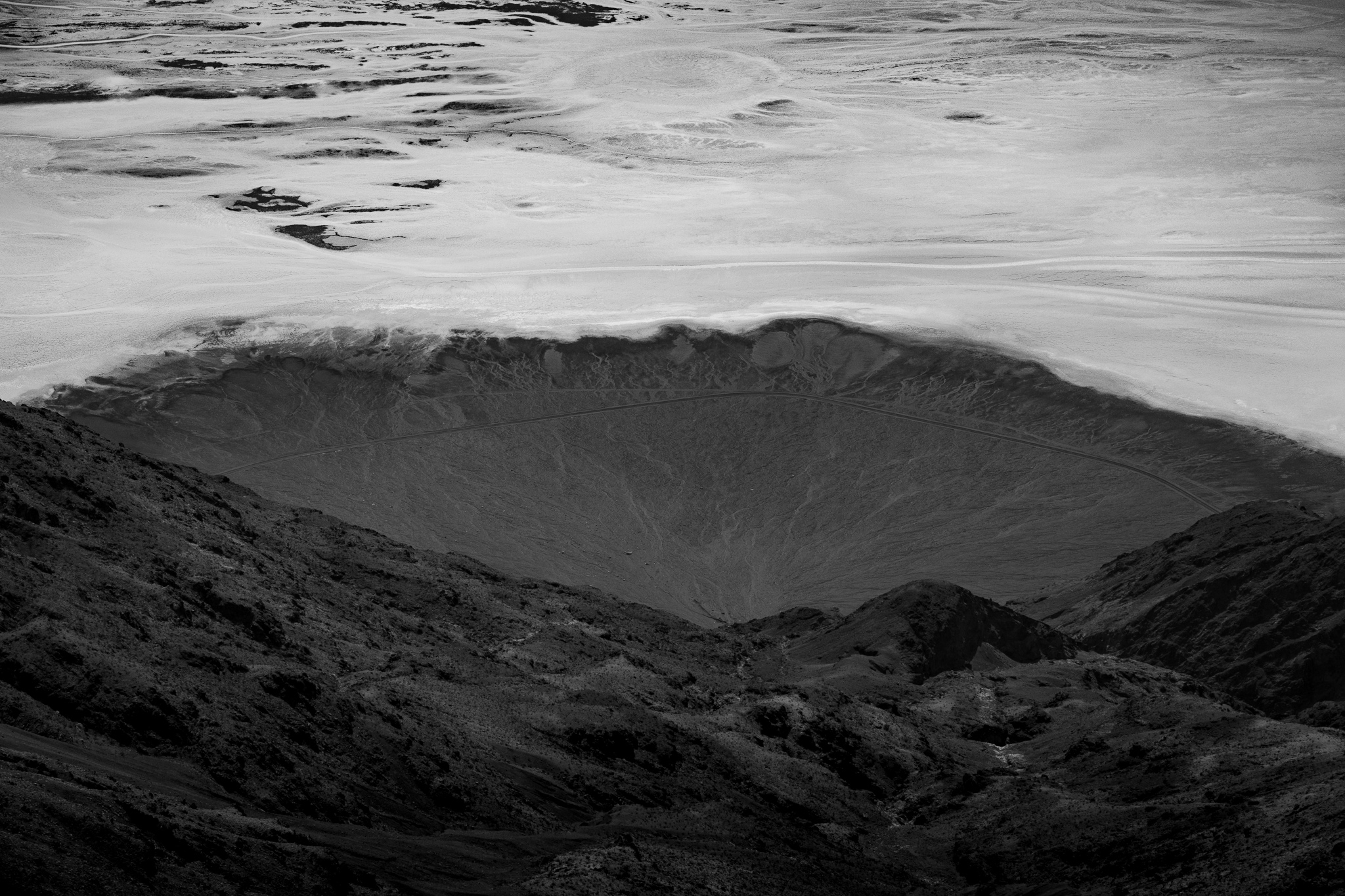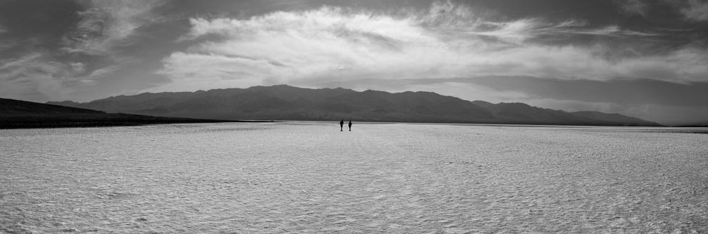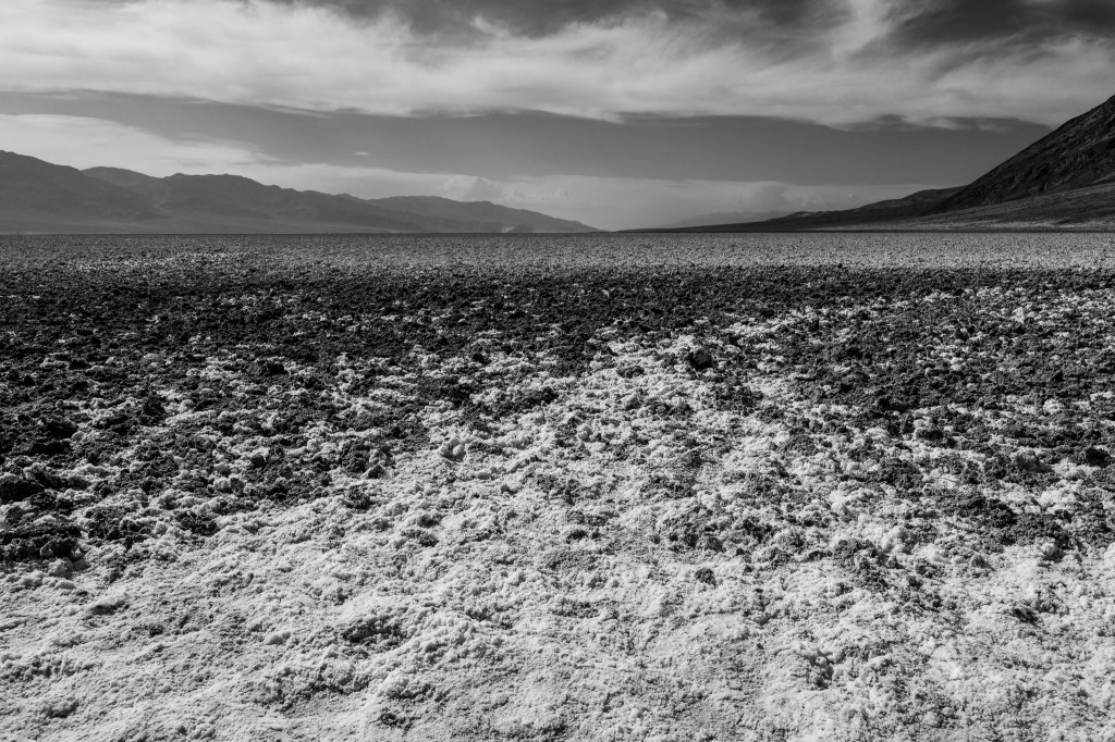 After about 30 minutes we headed to our next stop, Badwater, which is a salt flat and the lowest point in the United States at 282 feet below sea level. It is a vast area of salt on top of mud that seems to go for miles. It was hot, measuring around 108 degrees and I felt a bit like I’d pass out on the way back to the tour van. I really wanted to compose my images so that the vast salt led the viewer out to the mountains, so I tried my best. I gave some of them a black and white treatment that worked out well.