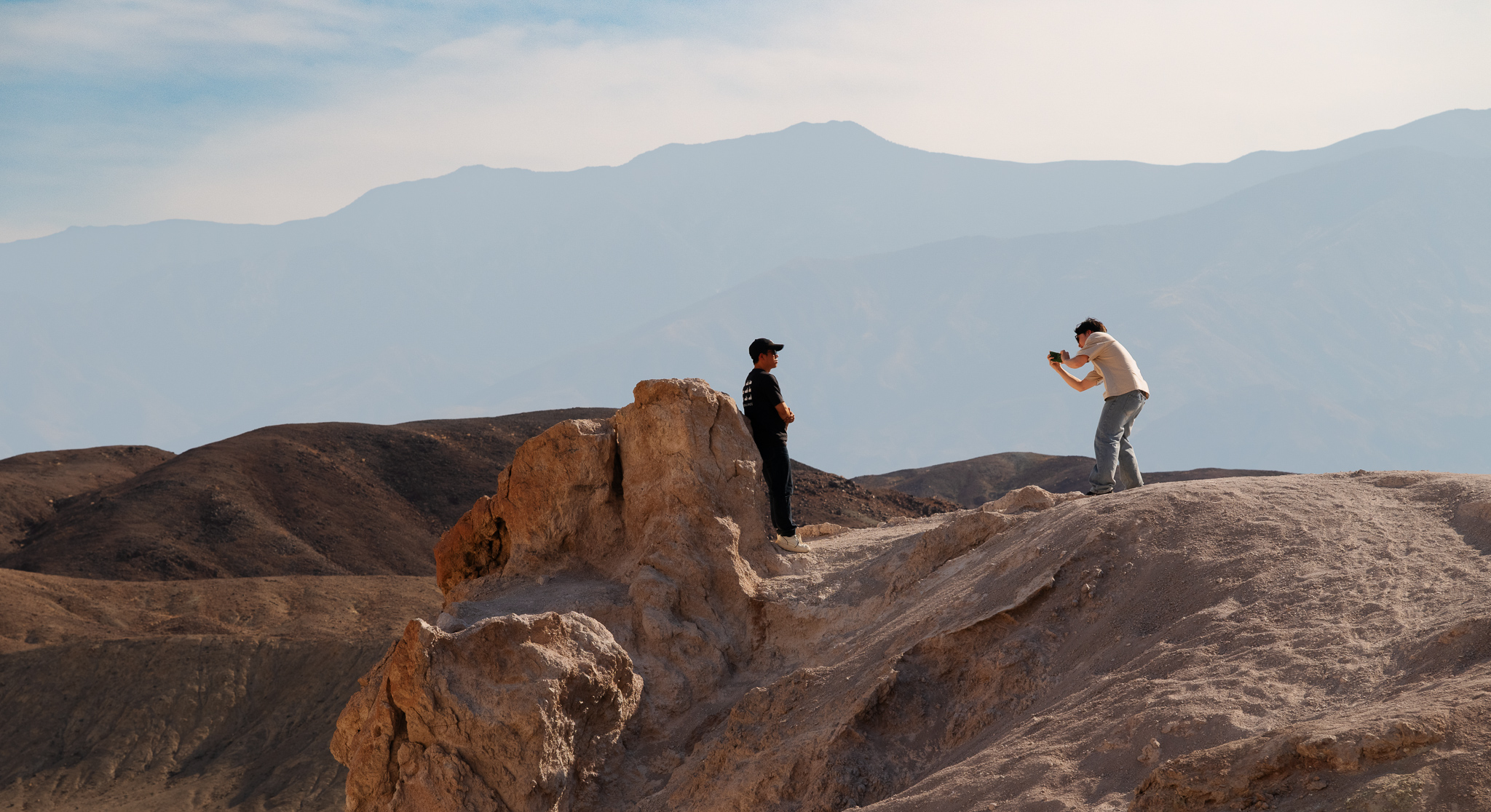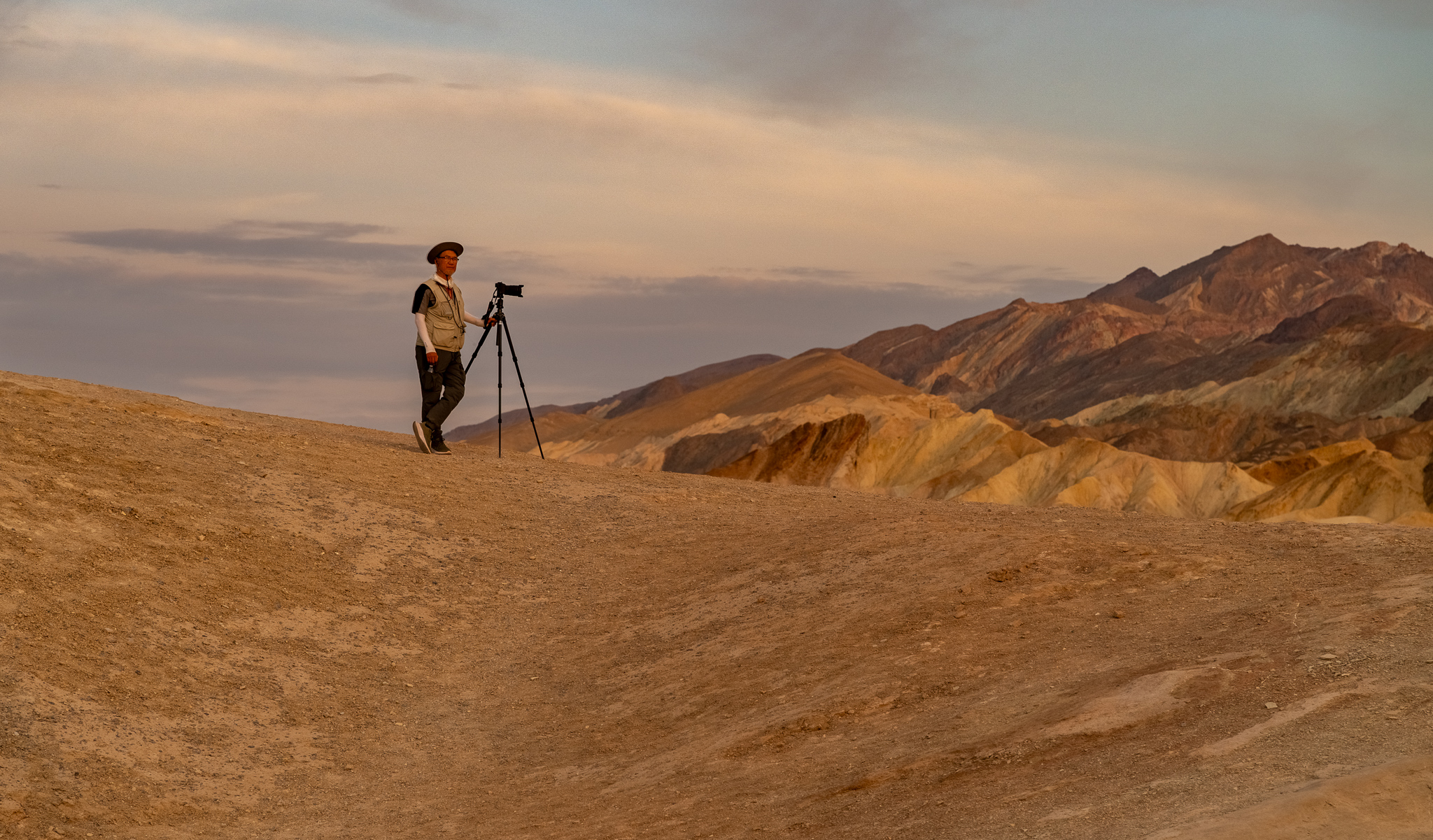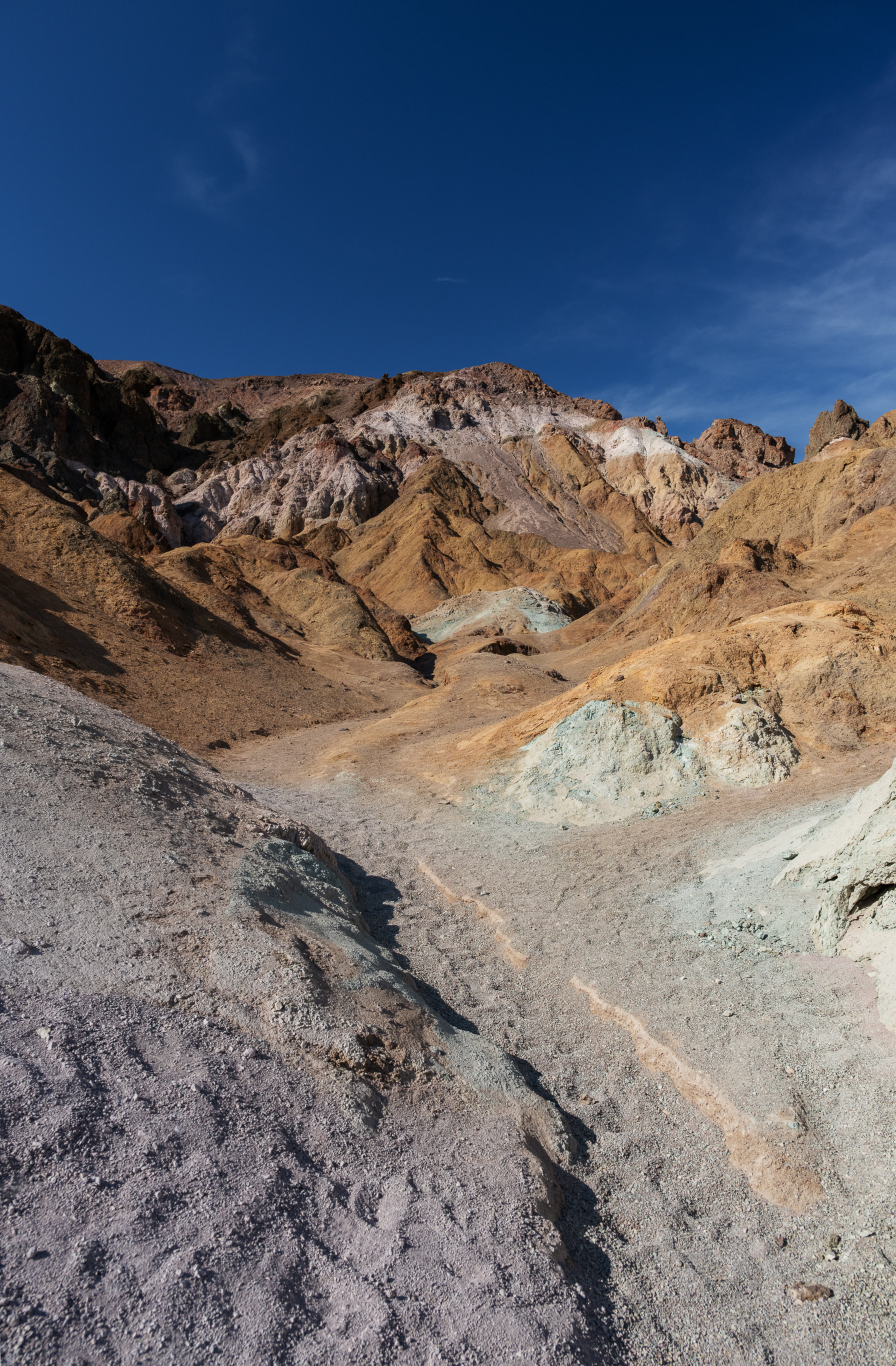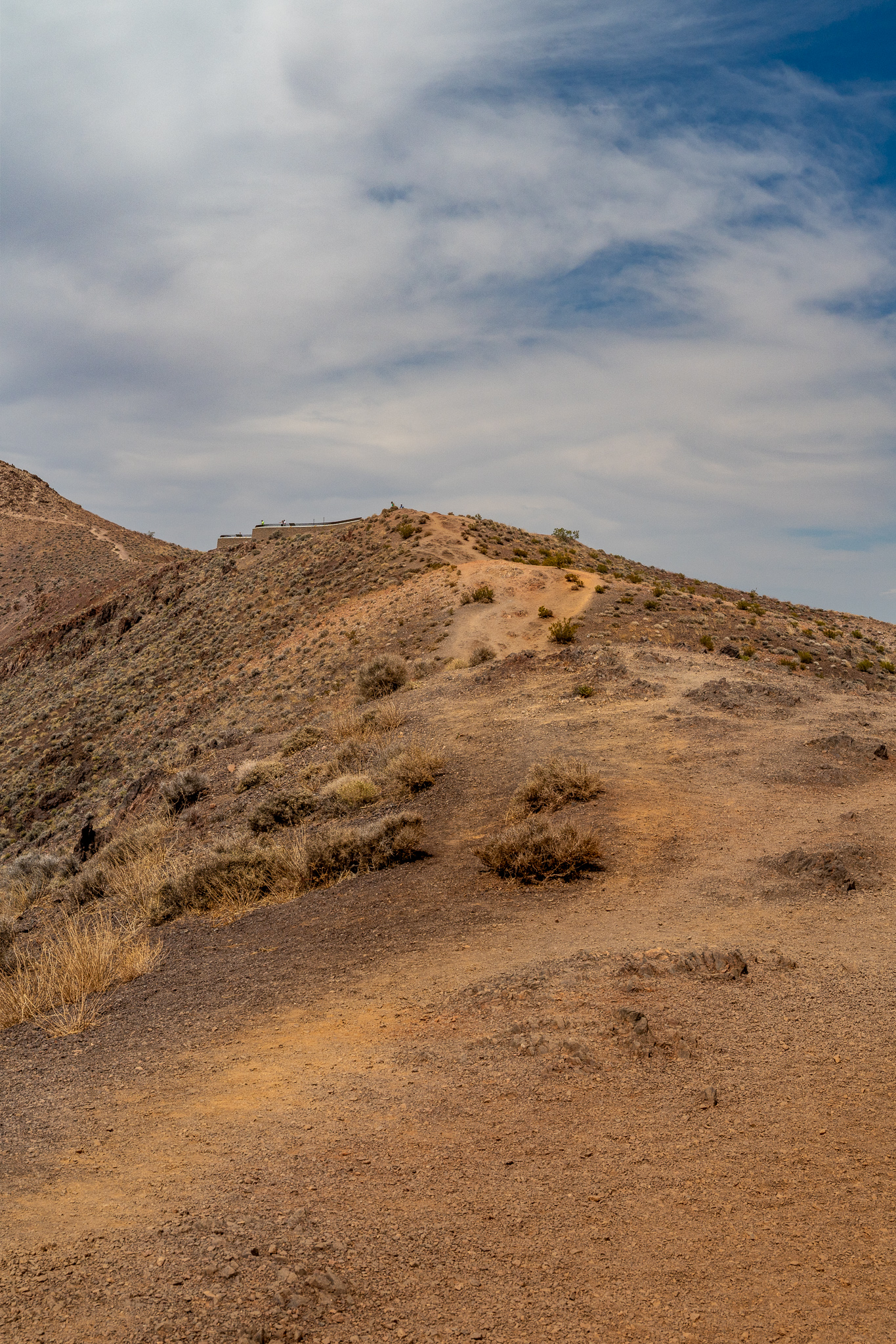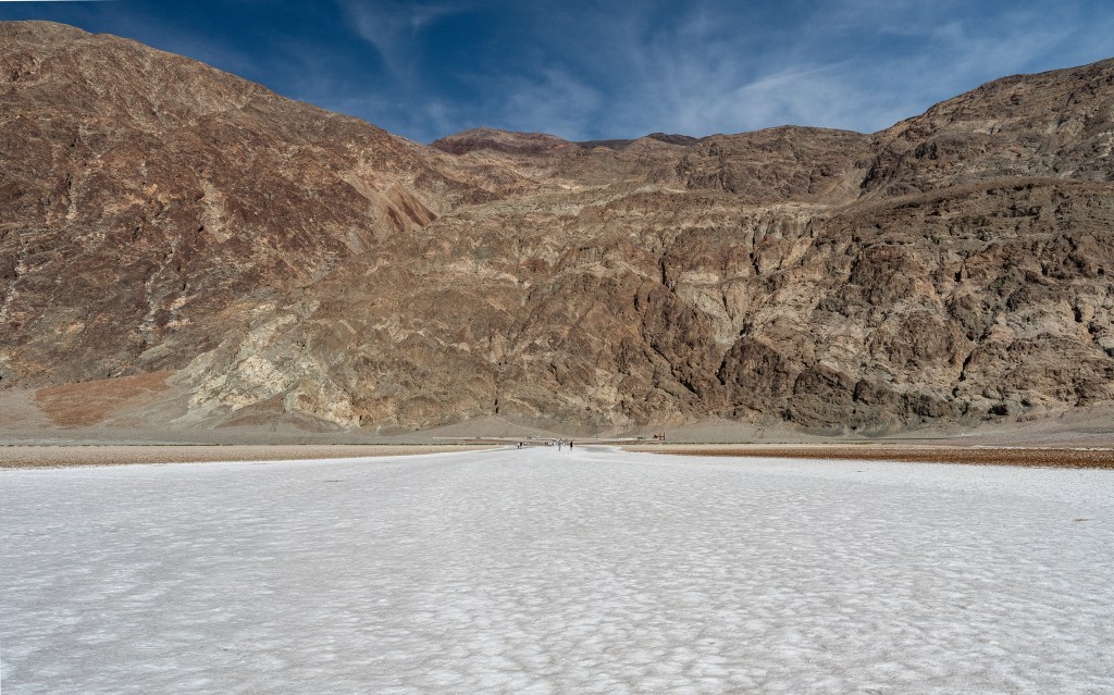 Our first stop was Dante’s View. This is a hilly area with a view of the vast mountains and salt flat basin below. There are cool colored hills in the distance and nicely defined paths up the hills in the area, which made for good leading lines, especially with people on them.