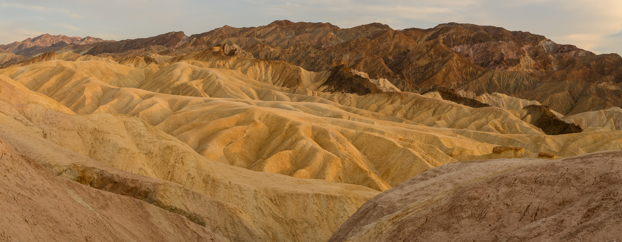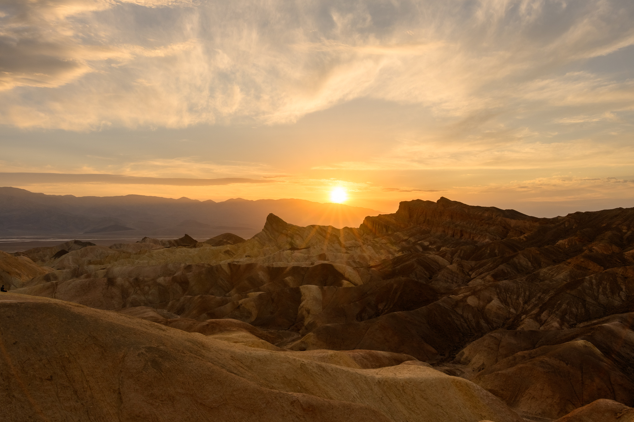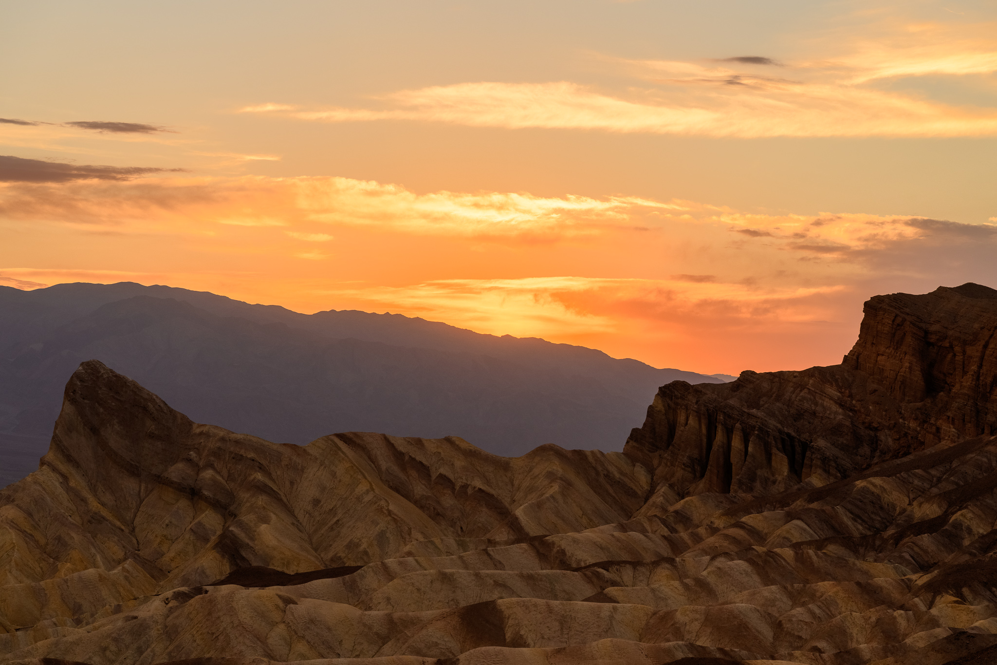 Zabriskie Point is a popular location to view the sun setting over the mountains and there were already some people ready to take it in. I found the whole place breathtaking. There were hilly mountains to my left, golden in the setting sun. There were dark etched mountains to the right, in front of the setting sun. People were sitting on a ledge watching while photographers set up their tripods. It turned out to be a gentle sunset, but I really enjoyed it, capturing images until the last bits of light went away and the blue hour began.