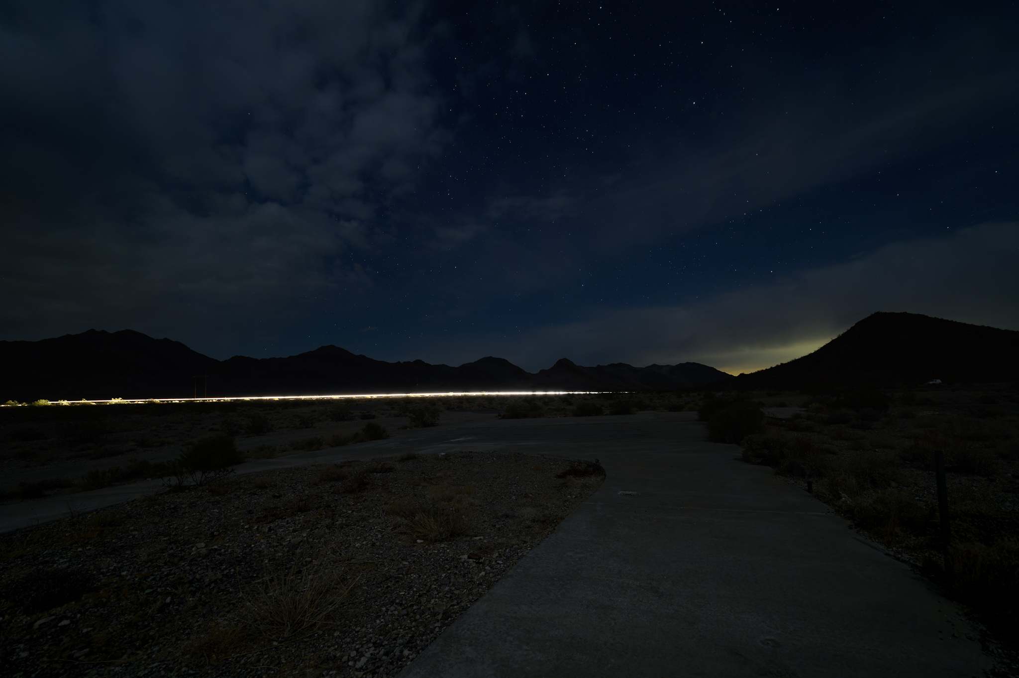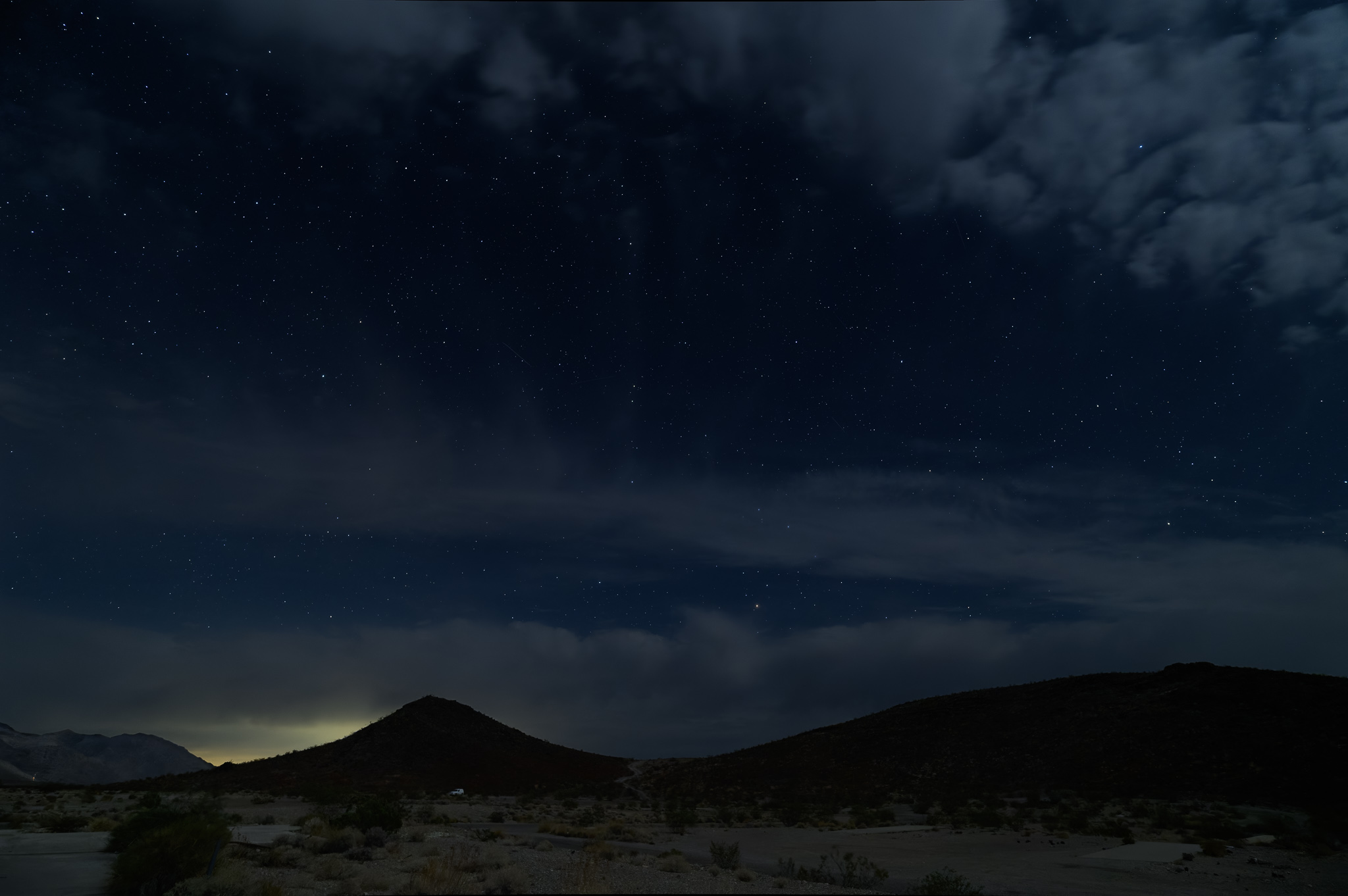 That kicked off the final leg of our journey, to Death Valley Junction to star gaze. By that time it was very cloudy and not a great night for star gazing, but our guides gave it a try anyway. I setup my tripod for the first and only time on the trip, pointed it toward the mountains, and started some long exposures. We spent more than a half hour there, but I didn’t end up with too many photos since it takes so much longer to set them up. The clouds did part for a bit so that we could capture some stars, but nothing fancy like the Milky Way or an aurora. I actually liked the way the clouds looked – they added visual interest. I also grabbed a light streak from a passing car that came out pretty well.