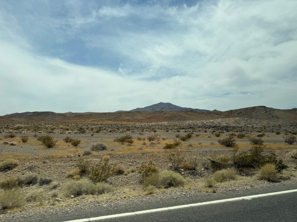 As we neared the California border, we were advised to put our phones in airplane mode as there was no cell coverage in the area. That’s because there’s absolutely nothing around but mountains, small plants, and windy roads. I took photos through the window of the van of the vast nothingness. As we neared Death Vally houses started popping up here and there, but they were sparse.