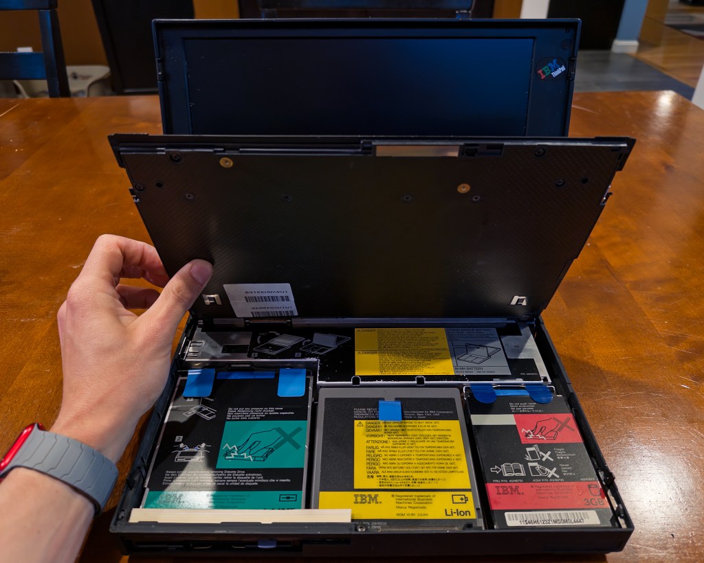 The tilted keyboard is neat, but doesn’t really add much to the comfort of the typing experience. Two latches can be pulled to set it flat if desired. The keyboard also conveniently lifts up like a car hood to reveal almost all of the internals including the battery, motherboard, drive bay, and hard drive. This was common on many ThinkPads of this era and you will often see images of the keyboards flipped up on eBay showing that the machine is missing a hard drive or battery.
