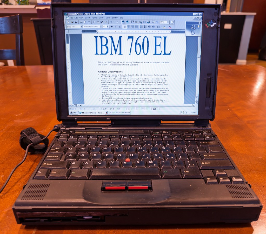 While the AC port is a bit sensitive, the battery can hold a brief charge before quickly dropping. Inside is what I believe to be a 120 MHz Pentium MMX running Windows 95 from a 3 GB hard drive in 8 MB RAM. It has Office 97 installed along with some CAD programs used to design circuits and Borland C++. This was someone’s work machine and they left their work on it. It’s not in pristine condition with some cracks, a grippy coating that has degraded into stickiness, and a stiff keyboard. Everything works but it’s not necessarily comfortable.