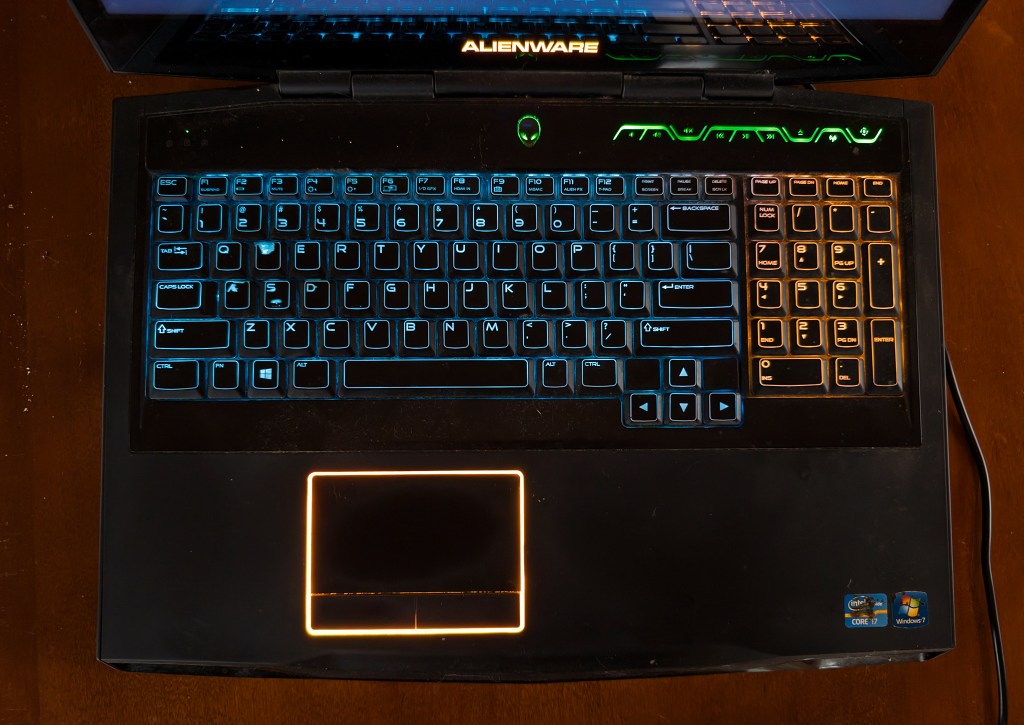It’s reasonably spec’d with a third generation Intel i7, 6 GB RAM, dual 700 GB hard drives, and an AMD Radeon HD 7970M graphics card. It is positively huge; its 17″ 1080p display makes it so wide it can fit a numeric keypad next to the keyboard. Speaking of the keyboard, it’s pretty cool, lighting up in RGB colors along with the outline of the trackpad.