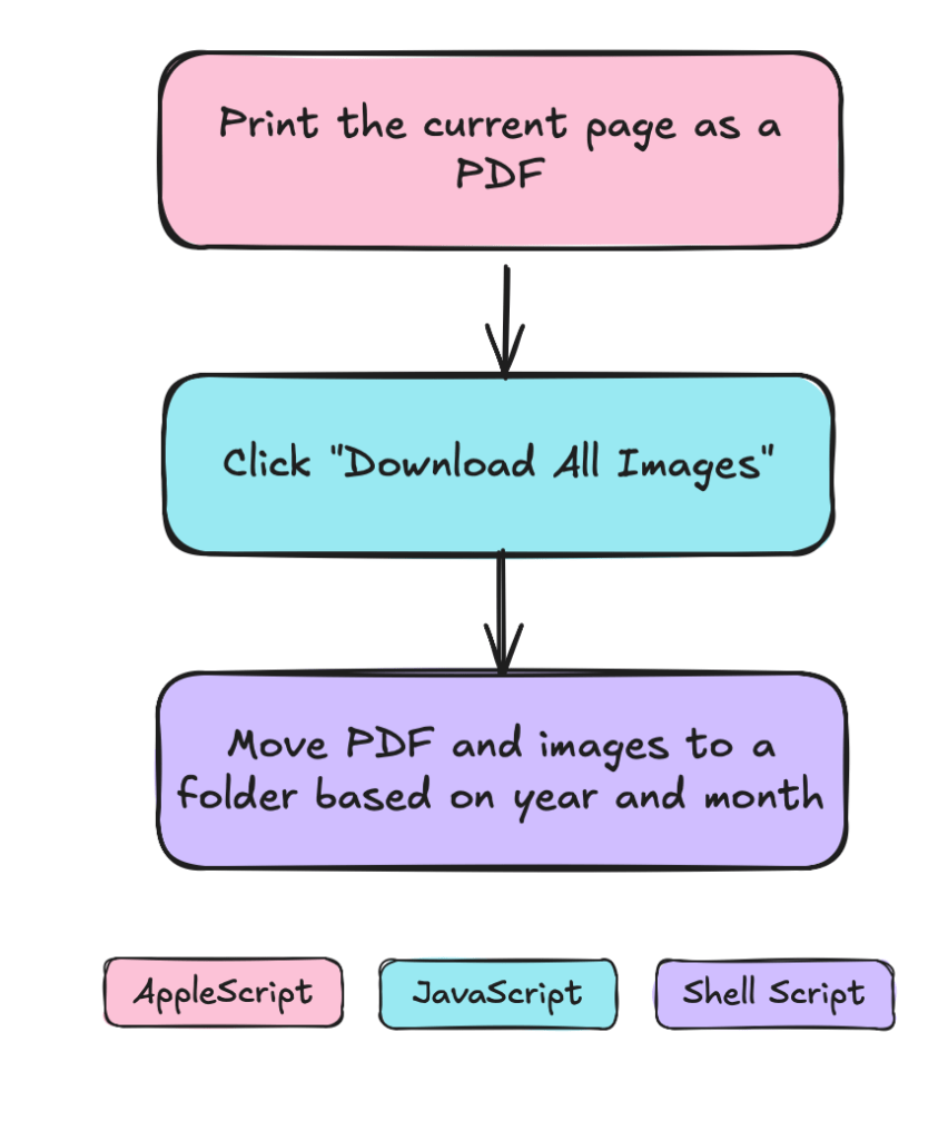 I continued working with Perplexity1 to move the zip file into the same directory as the PDF and to create a directory structure based on the year and month, which happen to be in the URL. This introduced shell script commands into my workflow to move the files. By the end I had a AppleScript loading the page and parsing the URL to create folder and file names, JavaScript telling Safari to click things, and shell scripts to move and rename files. The shell scripting was a pain because the commands execute without user context and it took me way too long to realize that I needed exact pathing.