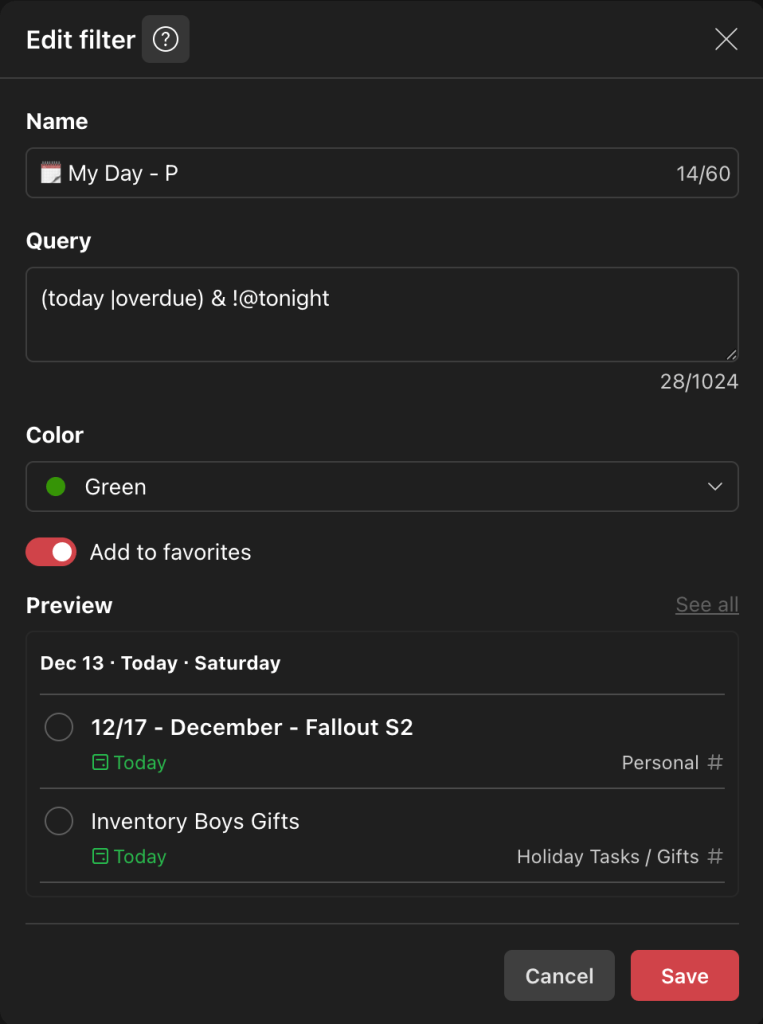 I’ve already used them to replicate the My Day view in Microsoft To Do, which shows tasks due today but excludes those labeled “tonight” that I plan to do after work. I also have filters that show tasks for tonight, tasks due tomorrow, tasks related to the members of my team, and my highest priority tasks for the day.