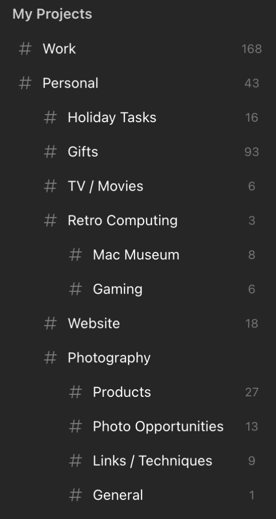 Todoist supports truly nested projects down to three levels. I have a “Work” project with two levels of projects underneath it. My “Personal” project contains my “Photography” project which contains my “Products”, “Photo Opportunities”, and “Links / Techniques” projects. I can add tasks to the general “Photography” project or any of its nested projects with ease.