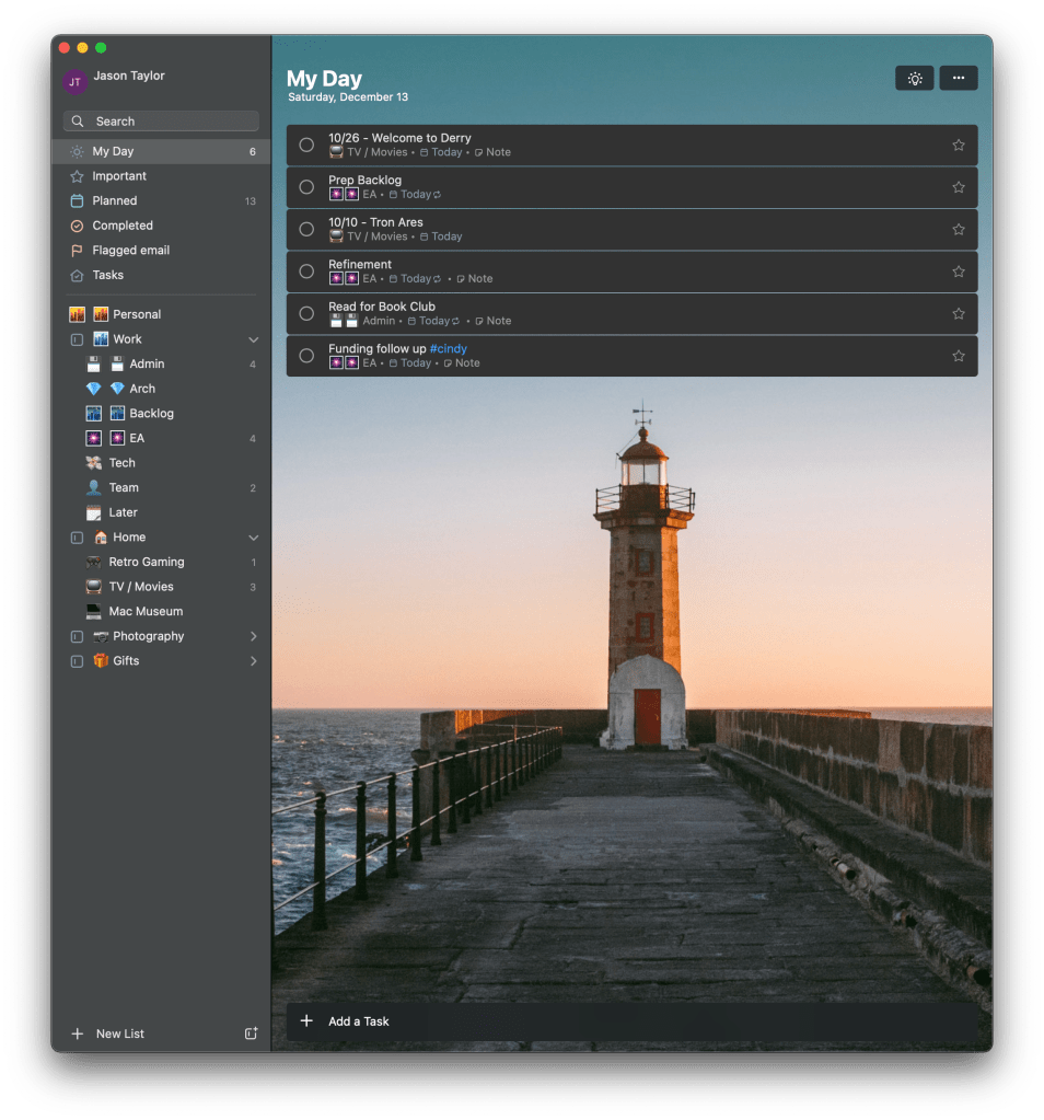 Microsoft To Do supports multiple task lists and ways to group them. I broke work tasks into multiple list by topic and grouped them under “Work”. I did the same with my home tasks, my photography tasks, and gift ideas. But these were truly groups. The “Work” group wasn’t a list that I could add tasks to, it was just a folder for other lists. There was no nesting allowed either, which is why I had a separate group for “Photography” instead of putting it under my “Home” group.