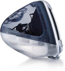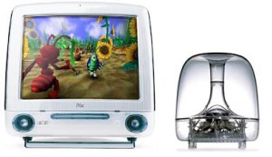 Although they still looked like their predecessors, the slot loading iMacs had an updated case and design. The plastic was more translucent and the metal shielding from the first generation was gone, offering a glimpse at the internals of the machine. Never before had the guts of a computer looked so sexy. You could literally peer right inside the machine and see the chips, wires, and heat sinks but there was just enough fogginess and color to the plastic that it didn’t look gaudy. The easy-to-break tray loading CD-ROM drive was replaced with a slot-loading CD or DVD-ROM drive. The slot loading drive worked like a car CD player and automatically fed in the media. It was a first for a Mac and the beginning of the end for tray loading CD/DVD drives on most Macs. Steve Jobs hated noise so the slot-loading iMac didn’t include a cooling fan, instead relying on heat sinks and convection cooling which resulted in a very quiet machine. The speakers were upgraded to a Harman Kardon “sound system” with an optional subwoofer (that looked like a jellyfish).
