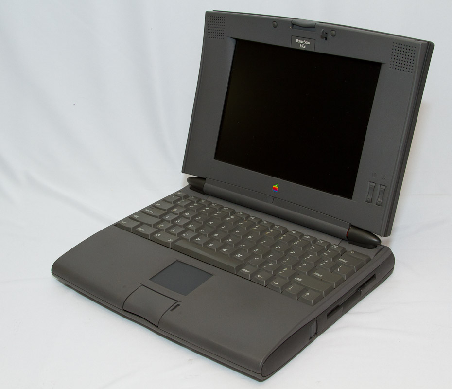 The PowerBook 500 series introduced a long-awaited refresh to the PowerBook line. Released in May 1994, the 500 series (code-named “Blackbird”) bid farewell to the boxy “Snow White” design of the PowerBook 100 series and replaced it with a smoother design inspired by the PowerBook Duo. The Duo remained on sale as Apple’s lightweight notebook while the 500 took over the full-sized spot. Along with the Duo 280 and 280c introduced at the same time, the PowerBook 500 models were the first PowerBooks to replace the workhorse 68030 CPU with a fast 68040. In addition it is notable for adding various new features to the PowerBook line including the trackpad, expansion bay, and built-in Ethernet.