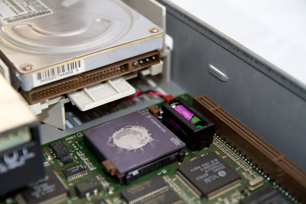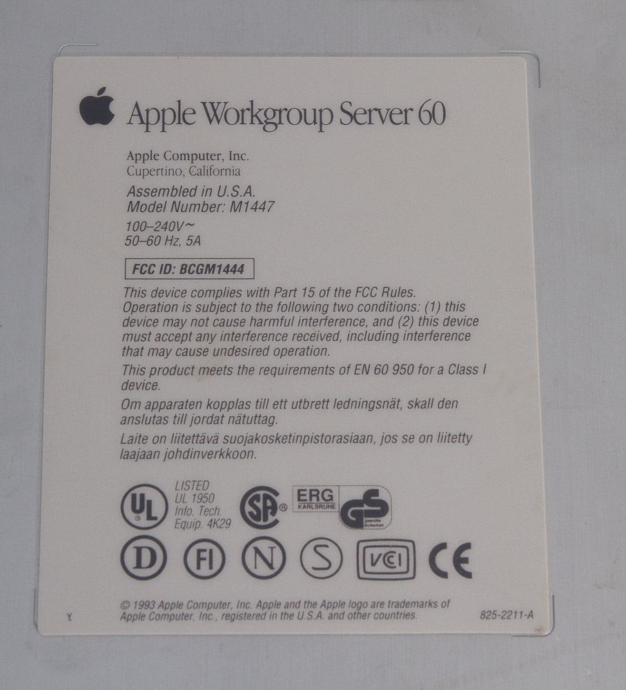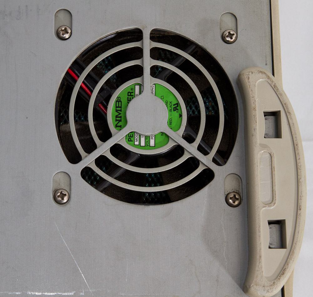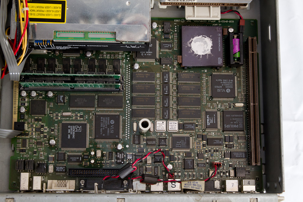 The Quadra 660’s case deserves special attention. It is a larger version of the Macintosh LC’s case, about a half inch taller and four inches wider, that can accommodate both a floppy disk drive and a CD-ROM. The same case is also used for the Power Macintosh / Performa 6100 series and the Workgroup Server 60 and 6150. It’s made out of sturdy “platinum” plastic around a metal frame. Like the LC, the case opens easily by pulling up on two tabs on the back of the machine and lifting the top. Not a single screw needs to be removed. The inside of the machine follows Apple’s tradition of good design both inside and out. Everything is organized and well laid out. The floppy, CD, and hard drive are located in the front of the case, the power supply is in the back right and the logic board on the left. The data and power cables are all folded and routed cleanly; nothing looks messy. The chips and circuitry on the logic board are lined up and grouped nicely. The inside of the machine is an efficient use of space, using the bottom to vent the power supply and provide a place for the speaker while still providing room for a NuBus expansion card. They pack quite a bit of computer into a very small space and still make it easy to upgrade. Pretty amazing for 1993.